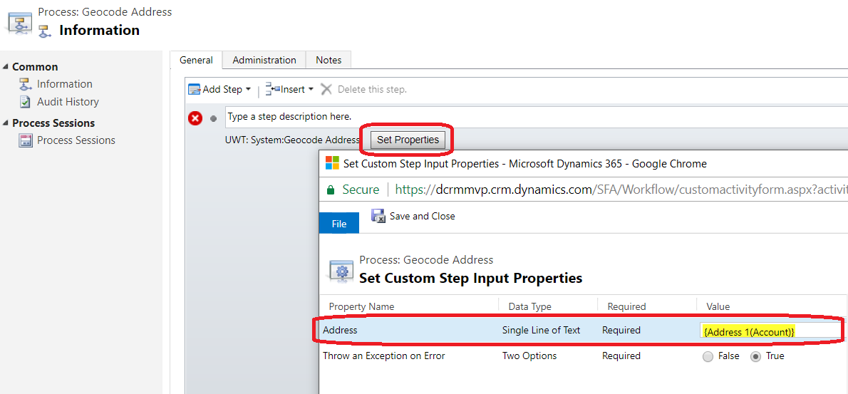After step is added click "Set Properties", populate "Address" input with address you want to geocode and click "Save and Close":
