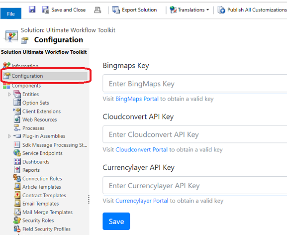 To geocode address from string representation (like to USA, WA, Redmond, 1 Microsoft way) to longitude/latitide you can use "Geocode Address" step. Before you start you have to get a valid BingMap key. To make this key available to Ultimate Workflow Toolkit add it to solution settings using "Configuration" tab of solution: