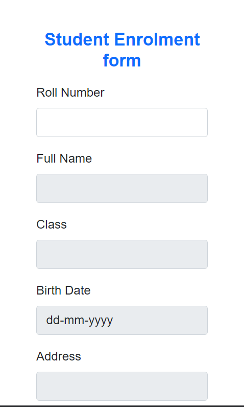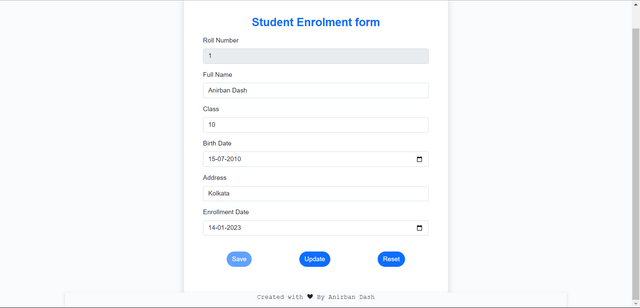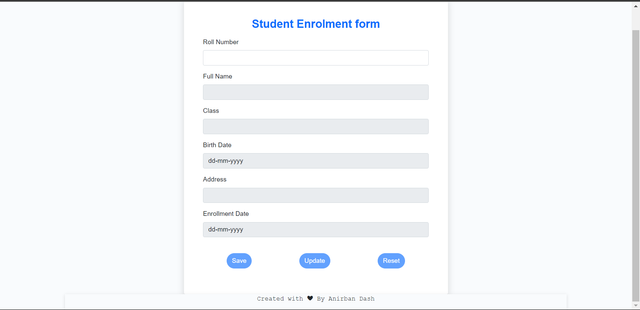 It is a student registration form that stores the user's data in JSONPowerDB. It supports REST APIs and serverless technology. Students can be added, updated based on their roll number. In this form, the roll number is automatically checked and by the help of API, the data entered into other input fields sothat the user can update accordingly. The application uses AJAX requests for smooth and fast interaction. All kinds of data can be stored, such as numbers, strings, dates, etc.