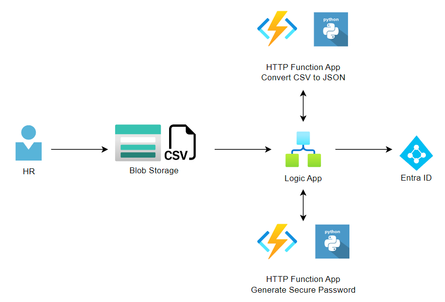 The Logic App triggers another HTTP Function App, also coded in Python, to generate secure passwords for the new user accounts.