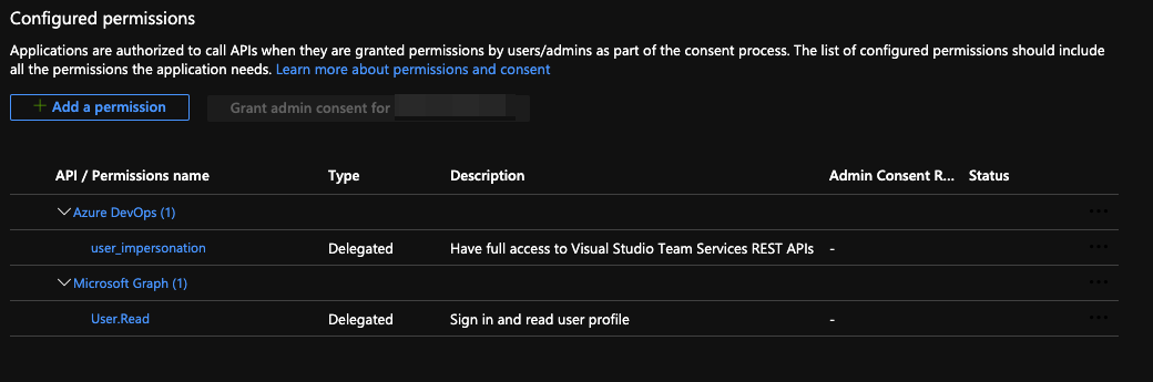 You also need to add the required API permissions to have 'Azure DevOps user_impersonation' and 'Microsoft Graph User.Read':