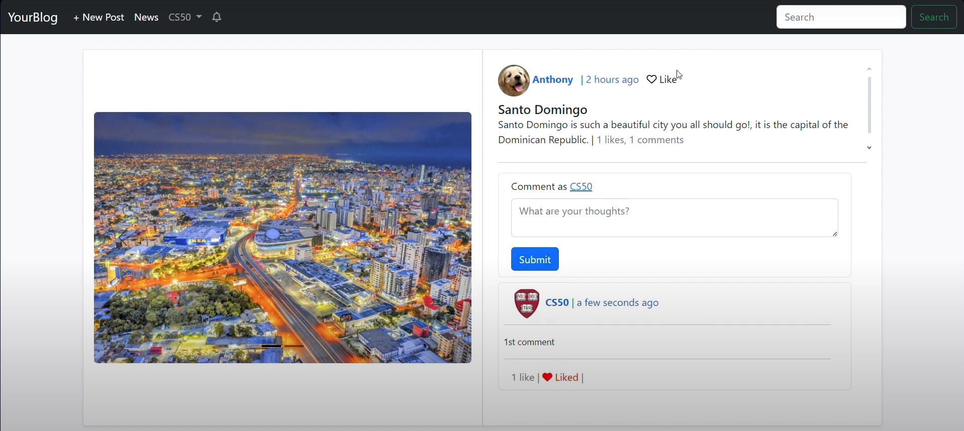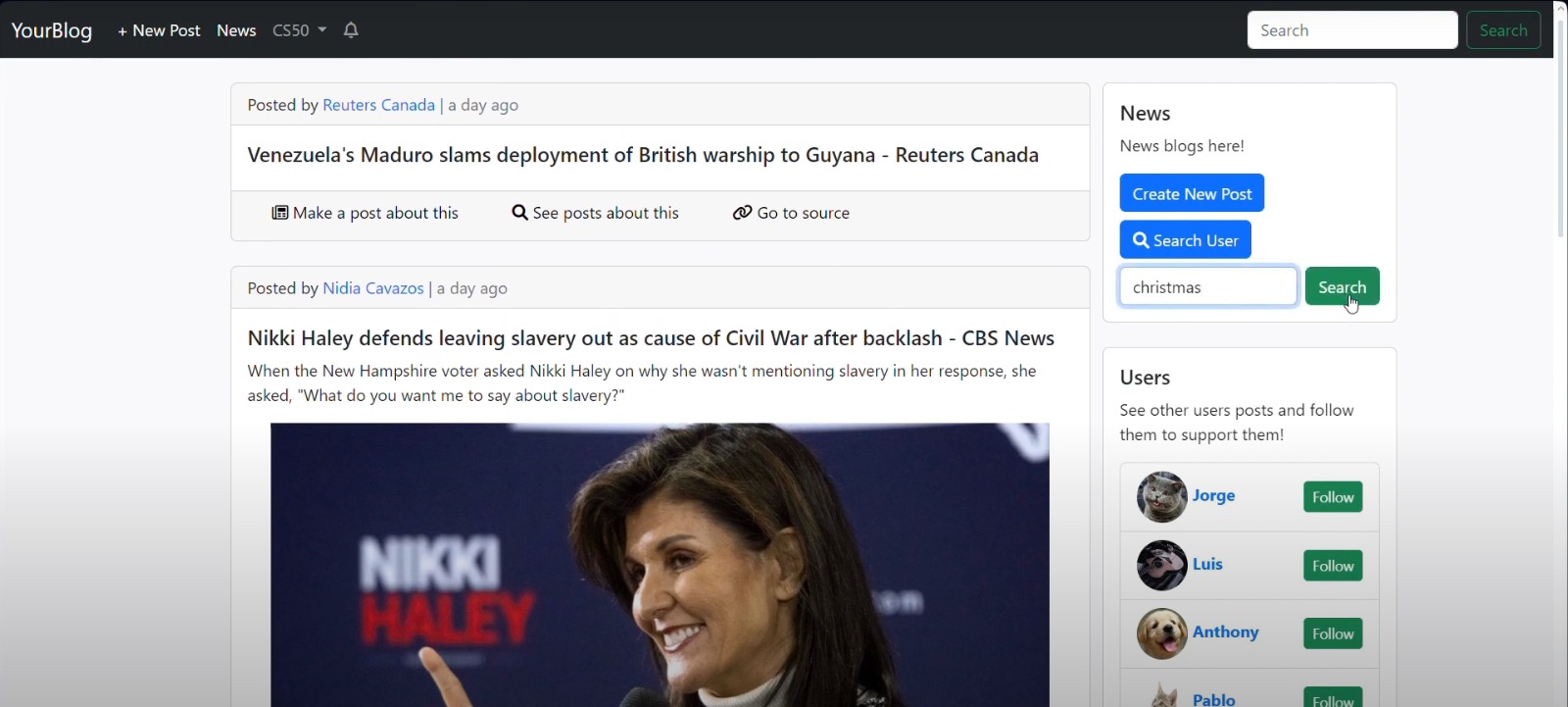YourBlog is a web application that allows users to make posts, comment those posts, see other posts, respond with posts other posts, like posts, follow bloggers, and make posts about news, see posts about others posts, go to news's urls, delete oneself's posts, edit own's profile, have notifications and more!