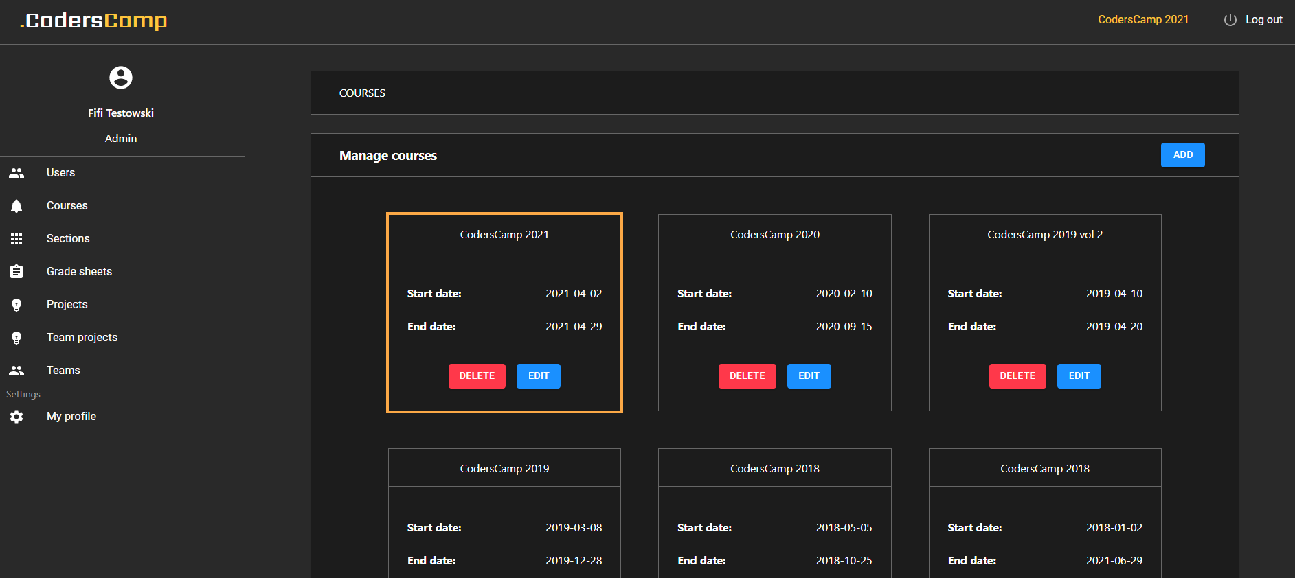 - App displaying the content of the active course by default - Application is displaying the information about the sections, projects, teams, etc. for the course selected in the Course Tab in the admin view (to initially filter out the content)