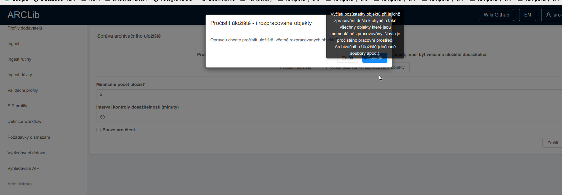 při najetí ukazatelem myši na tlačítko [Pročistit úložiště - i rozpracované objekty] vyskočí bublinková nápověda dříve, než uživatel stačí kliknout na toto tlačítko. A zakryje ho tak nešikovně, že u se na něj nedá téměř kliknout a tím aktivovat.