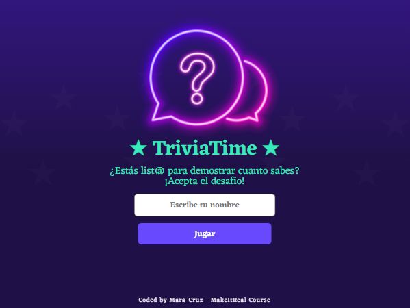 This project was created for a Make it Real challenge to develop a trivia website. It includes a welcome screen for users to enter their name, two trivia categories with at least three questions each, and three answer options per question. After completing the quiz, users can submit the form to see their results and have the option to play again.