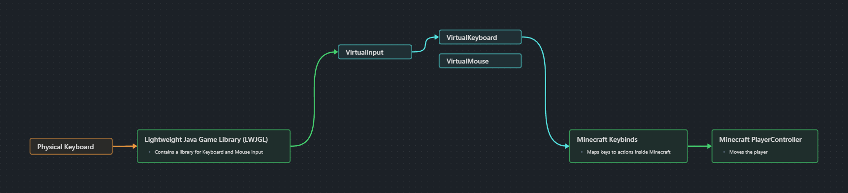 As you can see, the inputs from LWJGL are redirected to TASmods VirtualInput which internally splits itself up into VirtualKeyboard and VirtualMouse before going back to the Keybindings.