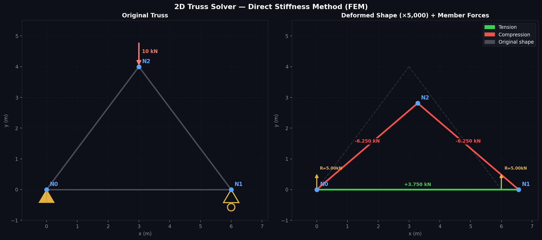 A complete finite element solver for planar truss structures, built from scratch in both Python and JavaScript. Uses the Direct Stiffness Method — the same algorithm behind ANSYS and Abaqus.