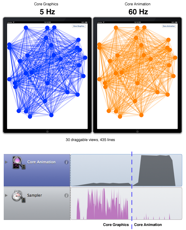 It is a simple iPad app intended to measure the difference between Core Graphics rendering and Core Animation (layer based) rendering. The app shows a number of draggable dots, connected by lines. When a dot is moved, the connected lines are updated to follow the dot. There are two implementations with vastly different performance and memory consumption: Core Graphics and Core Animation.