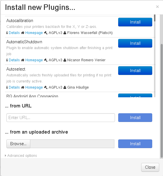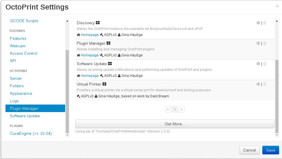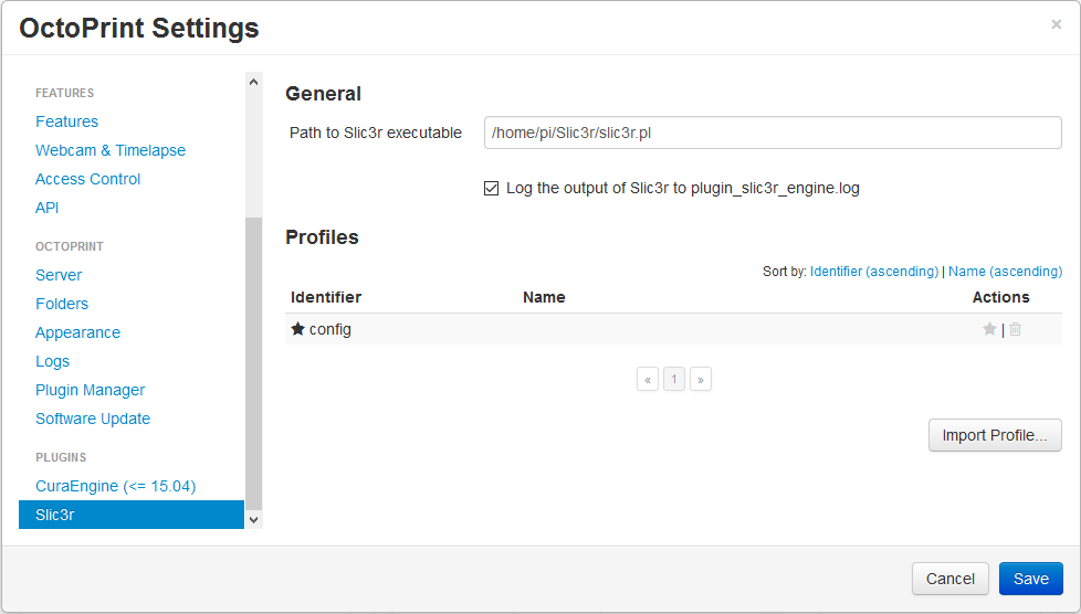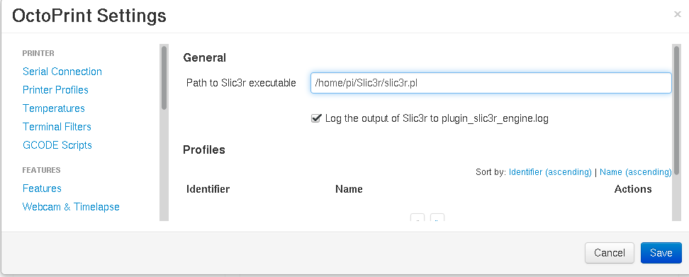 Execute OctoPrint and go to Settings (or restart when you are asked after installing the plugin). Slic3r should appear in Plugins list: