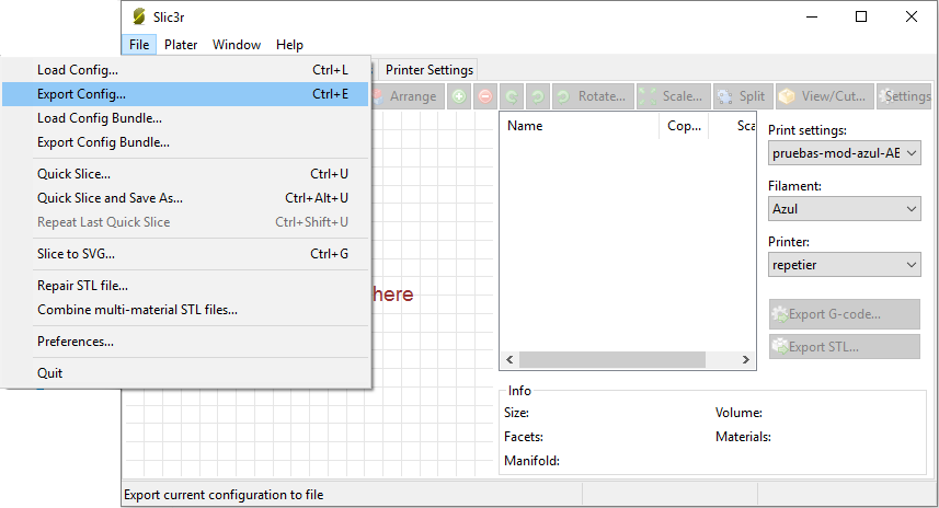 Before importing the profile, you have to export a file with the Slic3r's configuration. For that purpose, open Slic3r, and select File-> Export Config...