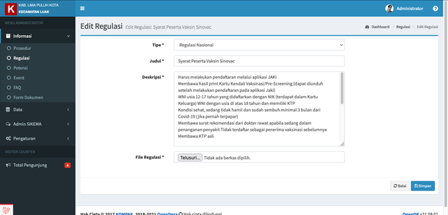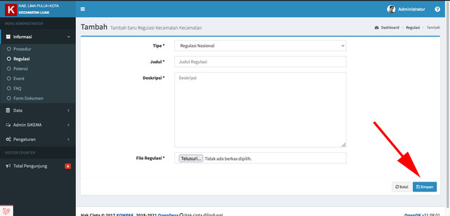 untuk mengelola data regulasi yang ingin ditampilkan, silahkan klik menu Informasi -> Regulasi