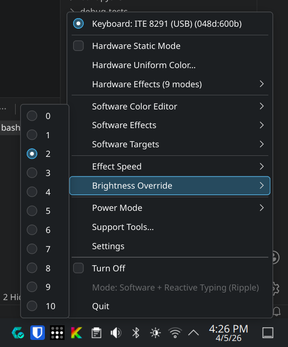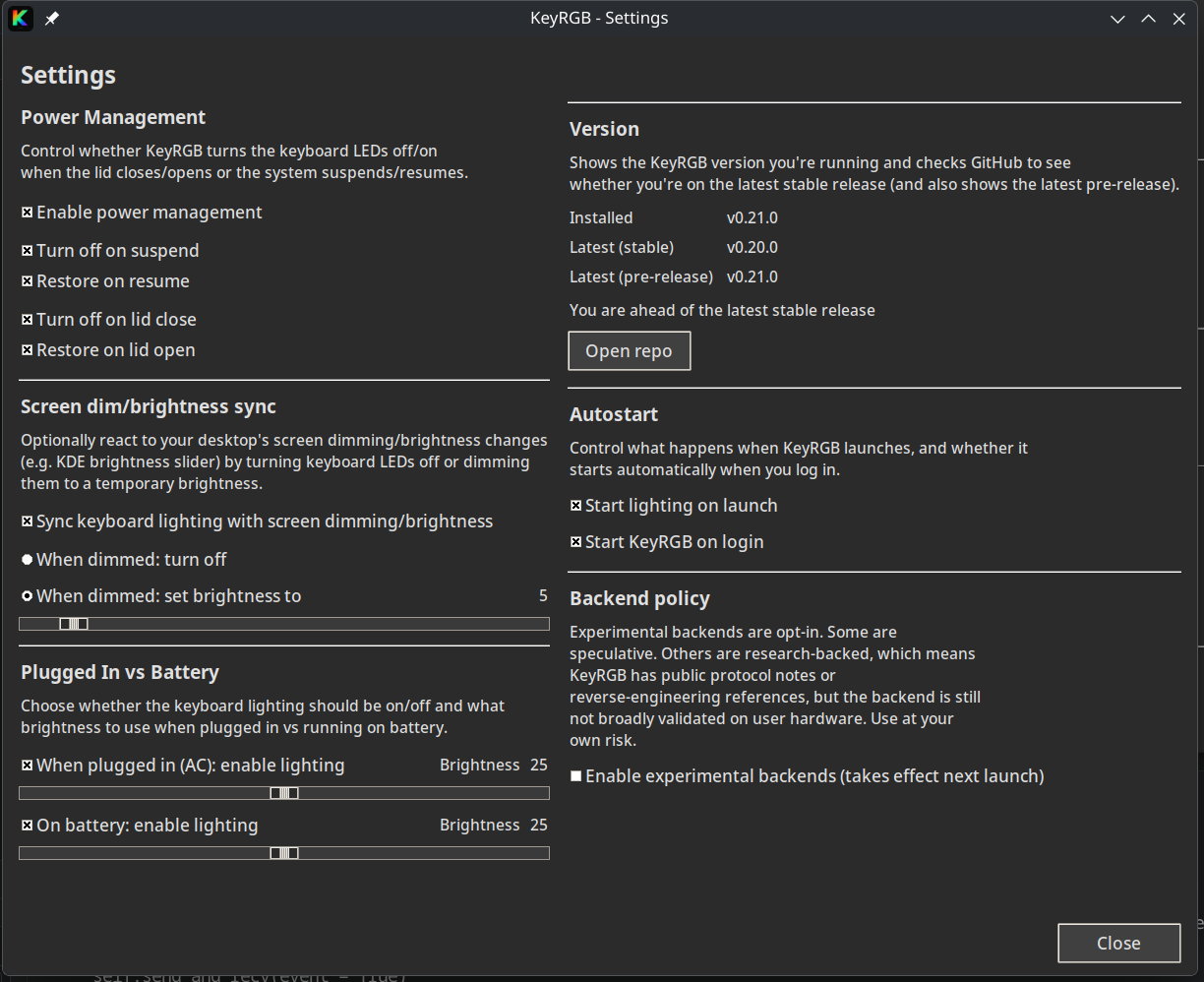 - Screen Dim Sync: optionally sync keyboard brightness with desktop-driven screen dimming/brightness changes (e.g. KDE brightness slider).