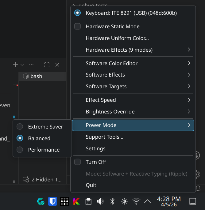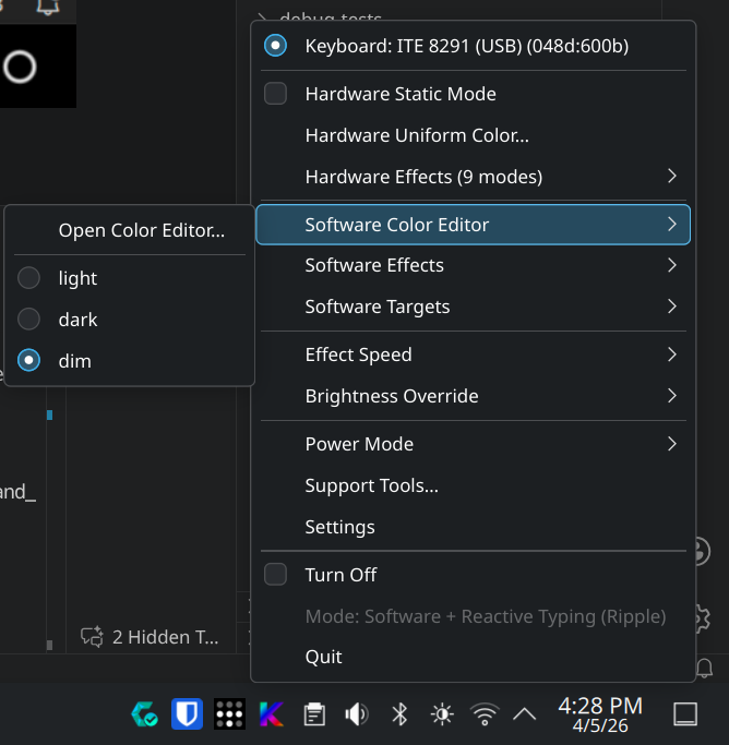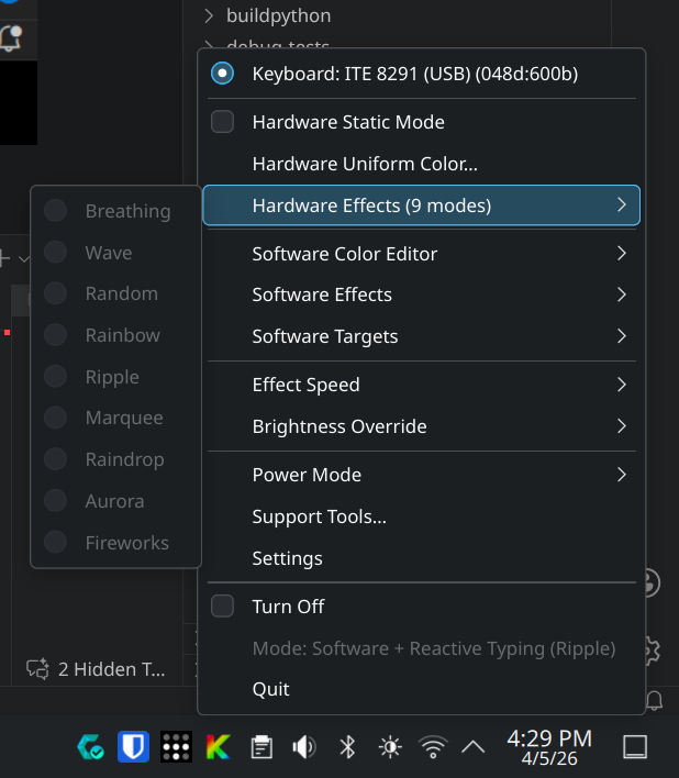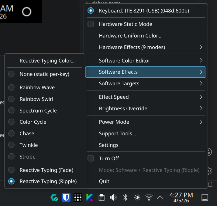 When a hardware effect name collides with a software effect name, KeyRGB stores the hardware selection with an hw: prefix to preserve the user's choice. Example: hardware spectrum_cycle is stored as hw:spectrum_cycle.