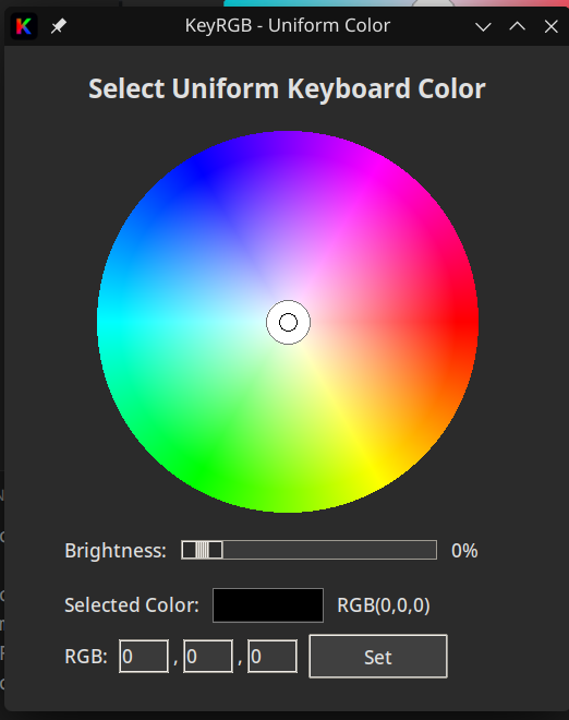 Your sysfs LED node is likely brightness-only (no multi_intensity, color, or rgb attribute under /sys/class/leds/*kbd_backlight*). KeyRGB can only change color when the kernel exposes RGB attributes (common on Clevo/Tuxedo/System76). On ASUS ROG laptops, use asusctl / rog-control-center for Aura/RGB control. |