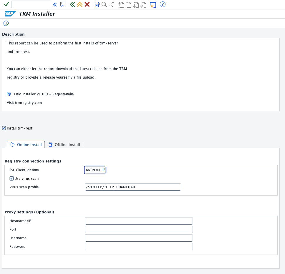 The standalone installer is a self-contained ABAP report that allows the installation of trm-server and trm-rest.
