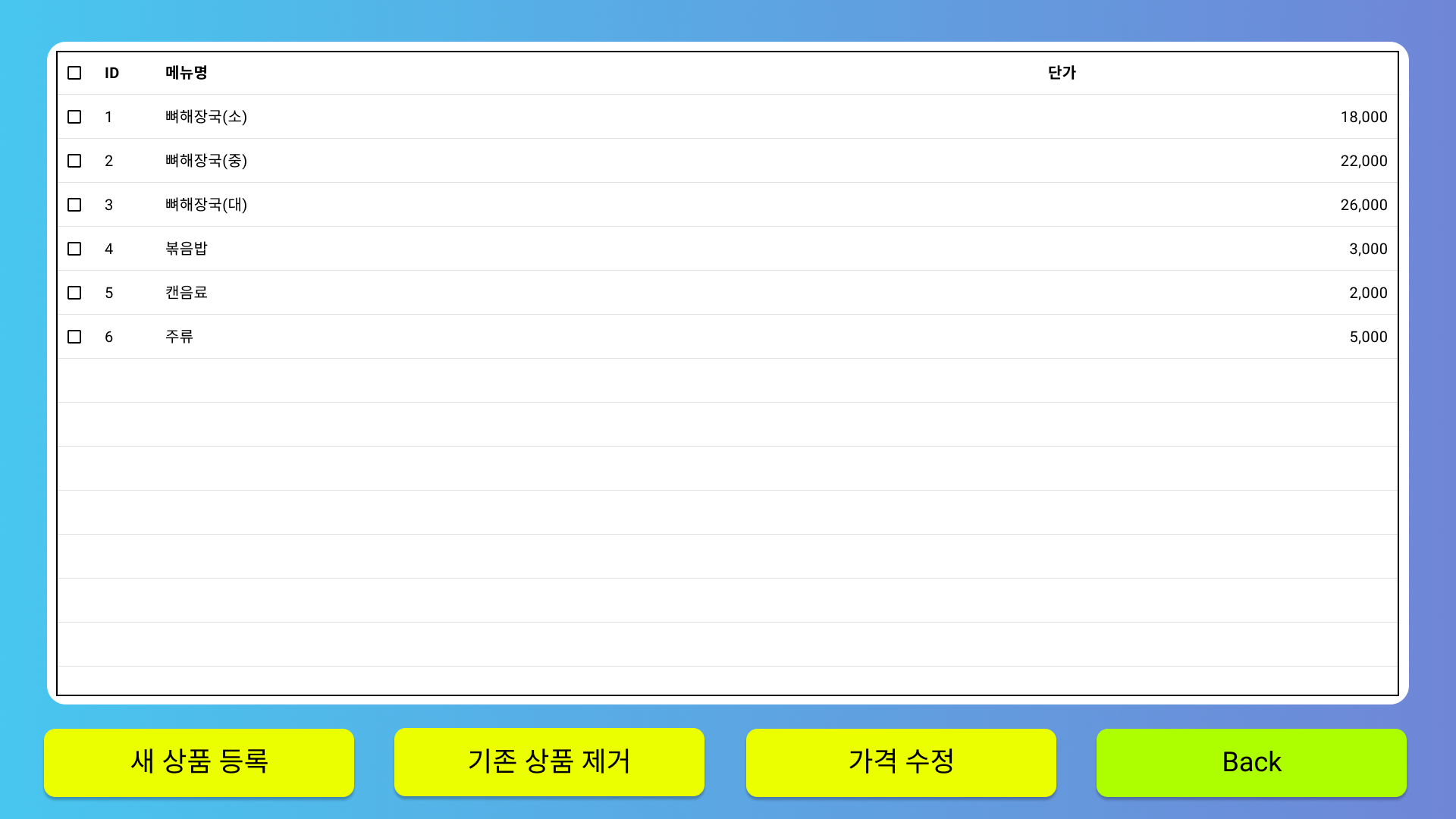 메뉴 등록 (이름, 가격, 재고) | |
