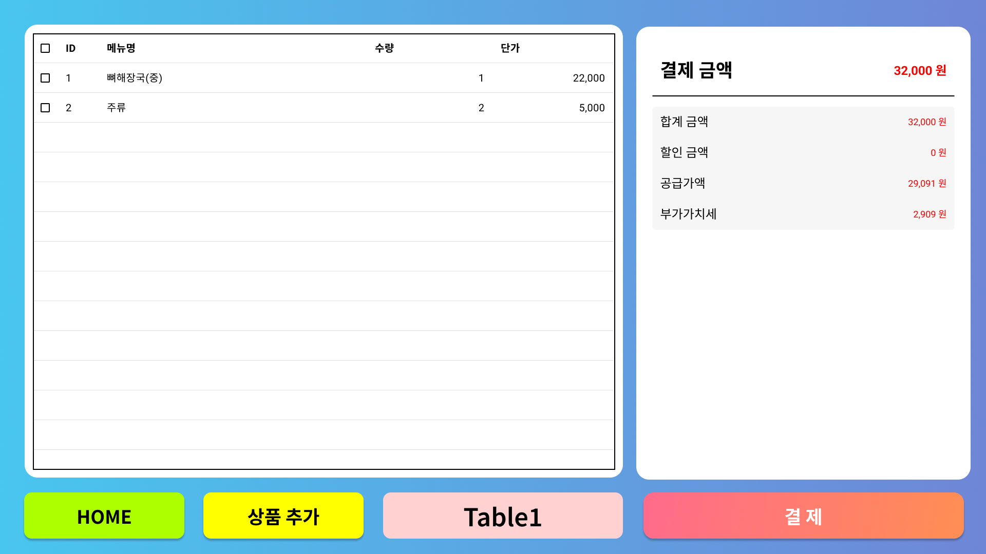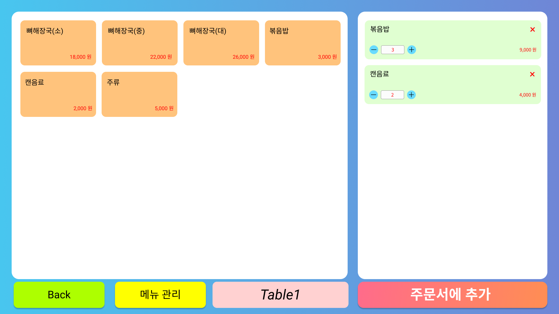 테이블에 메뉴 추가 (기본 수량 1) | |