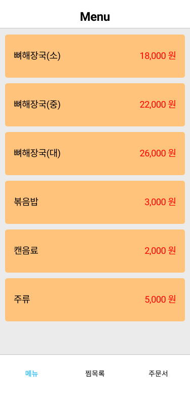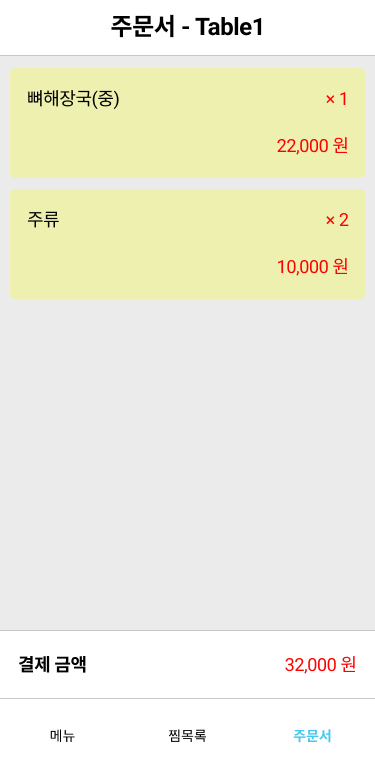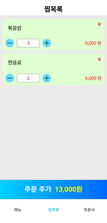 | 메뉴 선택 화면 | 찜목록(카트) 화면 | 주문서 화면 |