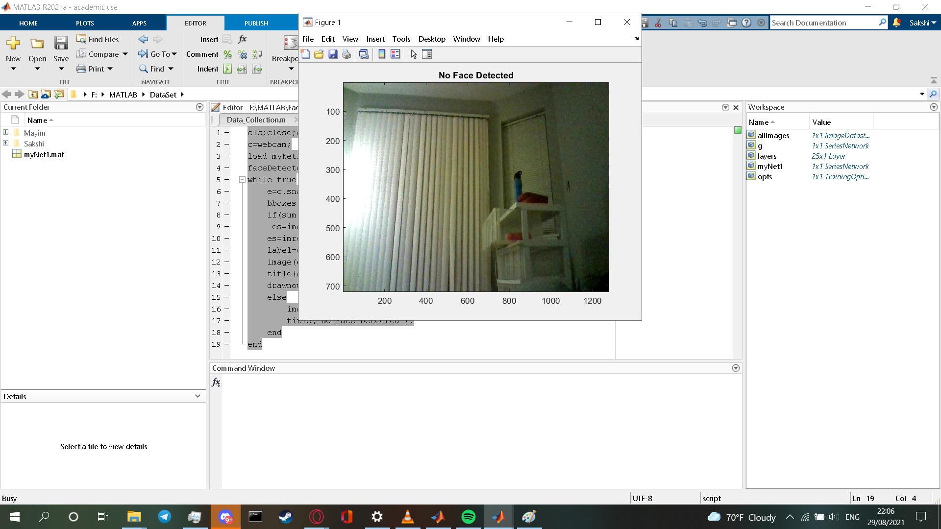 The file test.m contains the testing script for testing the model that we have just built. For testing, the model opens the webcam and detects the face in real-time. In the first image we can see that it is detecting Mayim Bialik's image via my phone correctly.