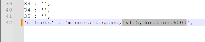 I'm going to change the effect a player will receive to Speed level 5, with a duration of 5 minutes. 6000 ticks = 300 seconds = 5 minutes:
