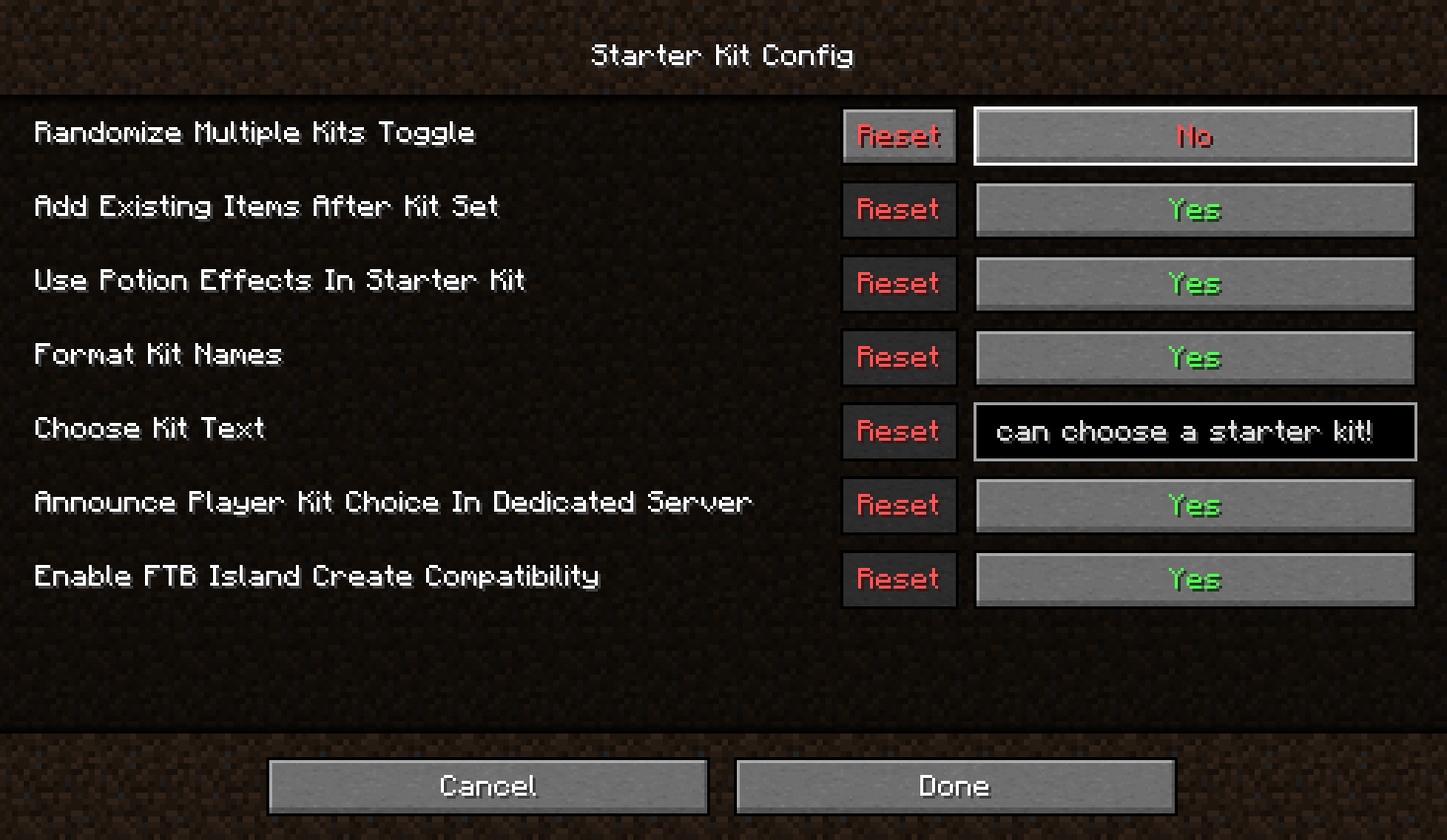 enableFTBIslandCreateCompatibility (default = true): Whether the starter kit should be re-set after the '/ftbteamislands create' command from FTB Team Islands. Does nothing when it's not installed.