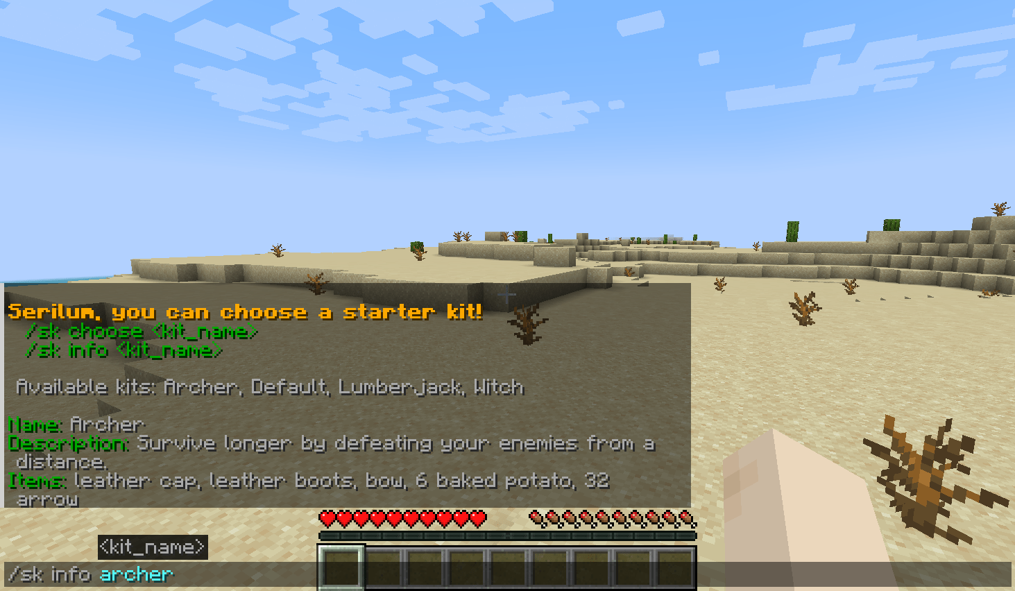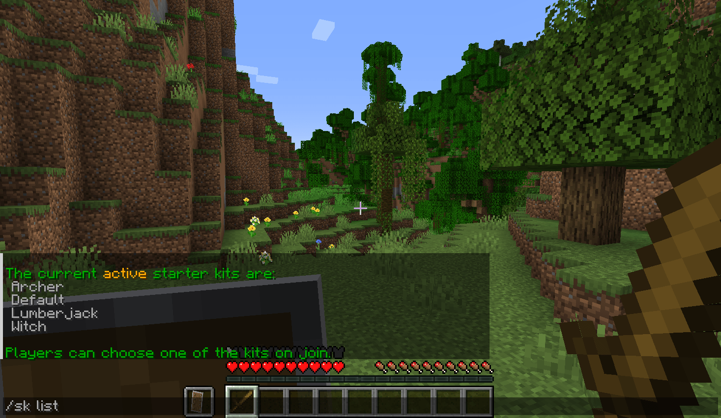 /sk choose <kit_name> - Allows players to choose a starter kit via commands. This is only needed when Starter Kit is not installed on the client and the server enabled kit choices.