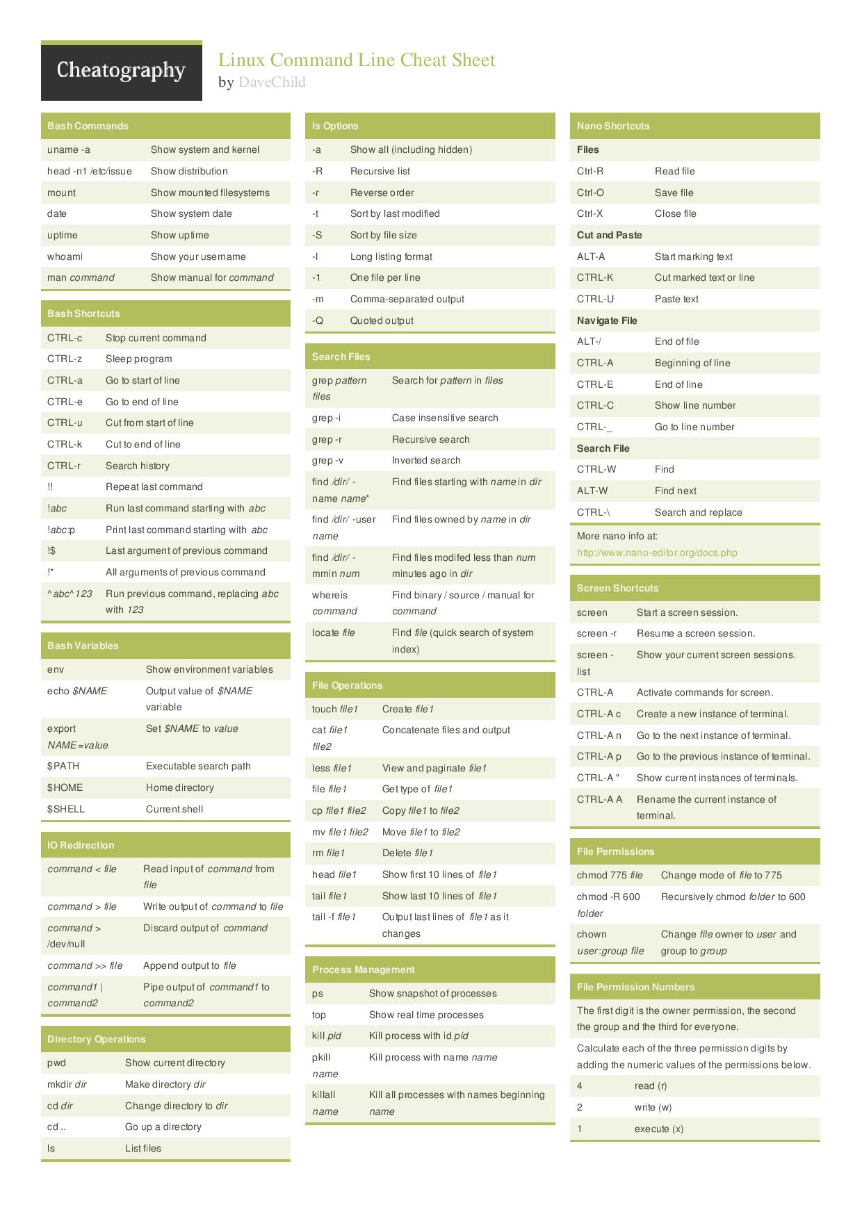 You can find a small/simple Linux Commands Cheatsheet ( by DaveChlid):