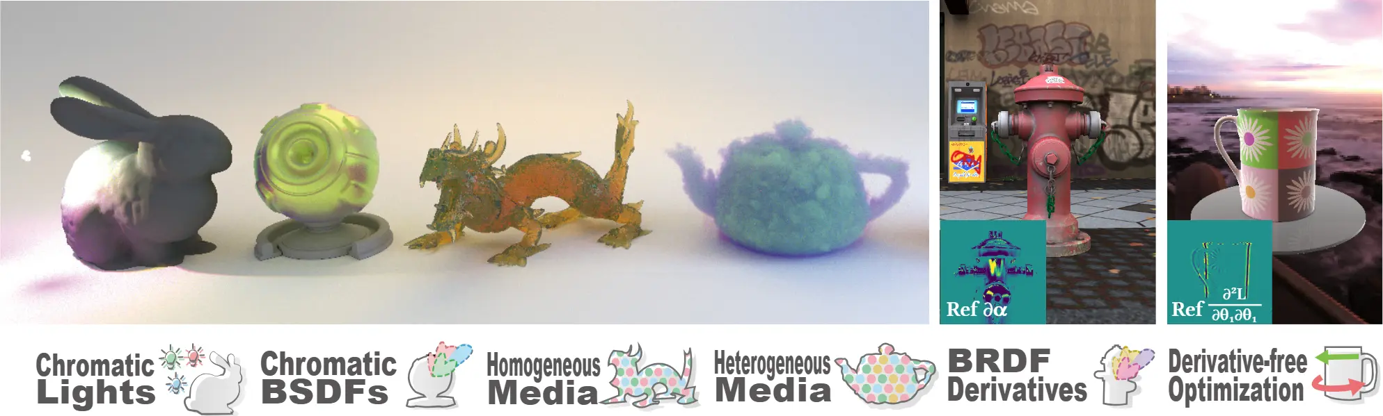 example-rglmat: ratio control variates for BRDF sampling. A material ball with RGL measured BRDF under uniform environment lighting. The material can be switched in editor.example-lightbvh: ratio control variates for many-light sampling and MIS. Direct illumination only. 3 test scenes can be switched inmain.py.- more examples later...
