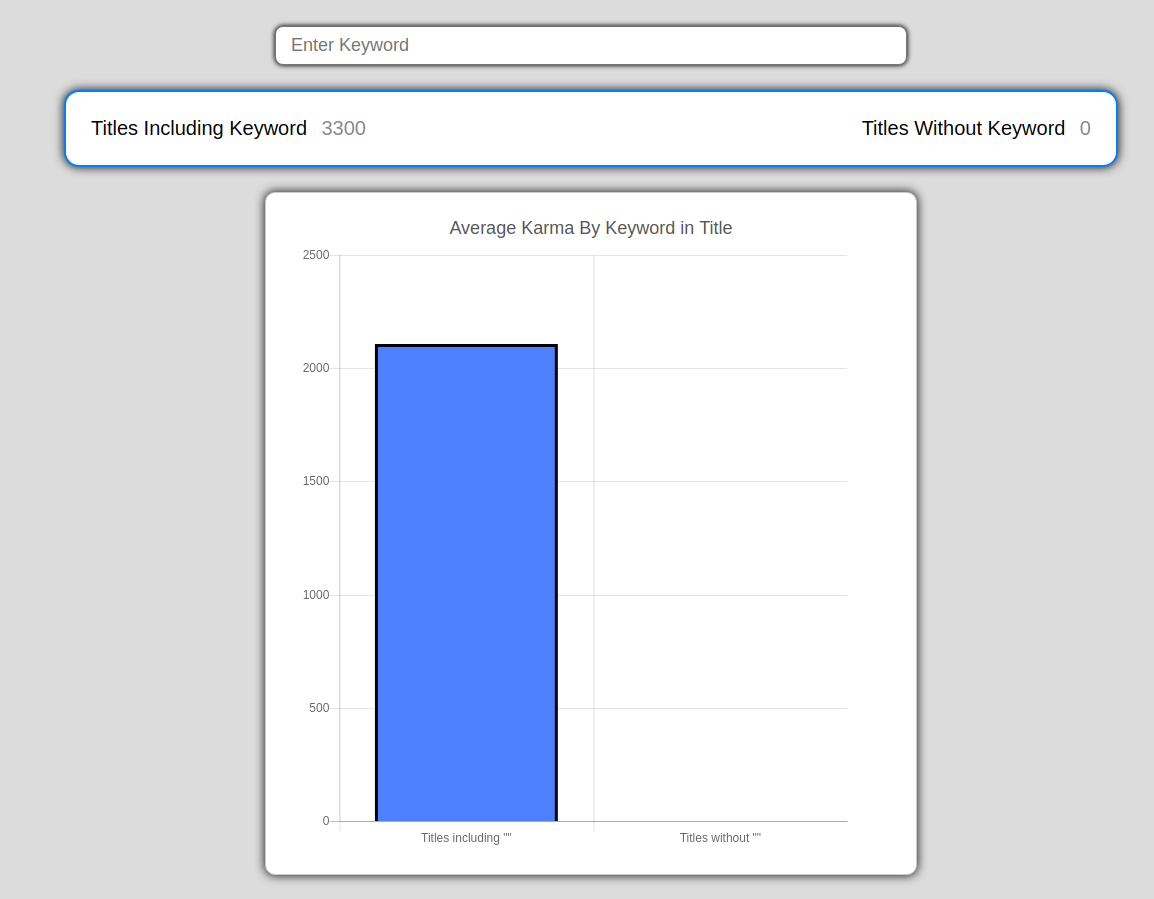 The graph continues to update each second as 100 additional posts are collected from Reddit, but it also updates itself (both the average karma displayed for each column and the column labels) as a user types into the search bar. Additionally, we can see that number of posts that match and do not match the keyword update themselves in the header as each character is typed into the keyword field.
