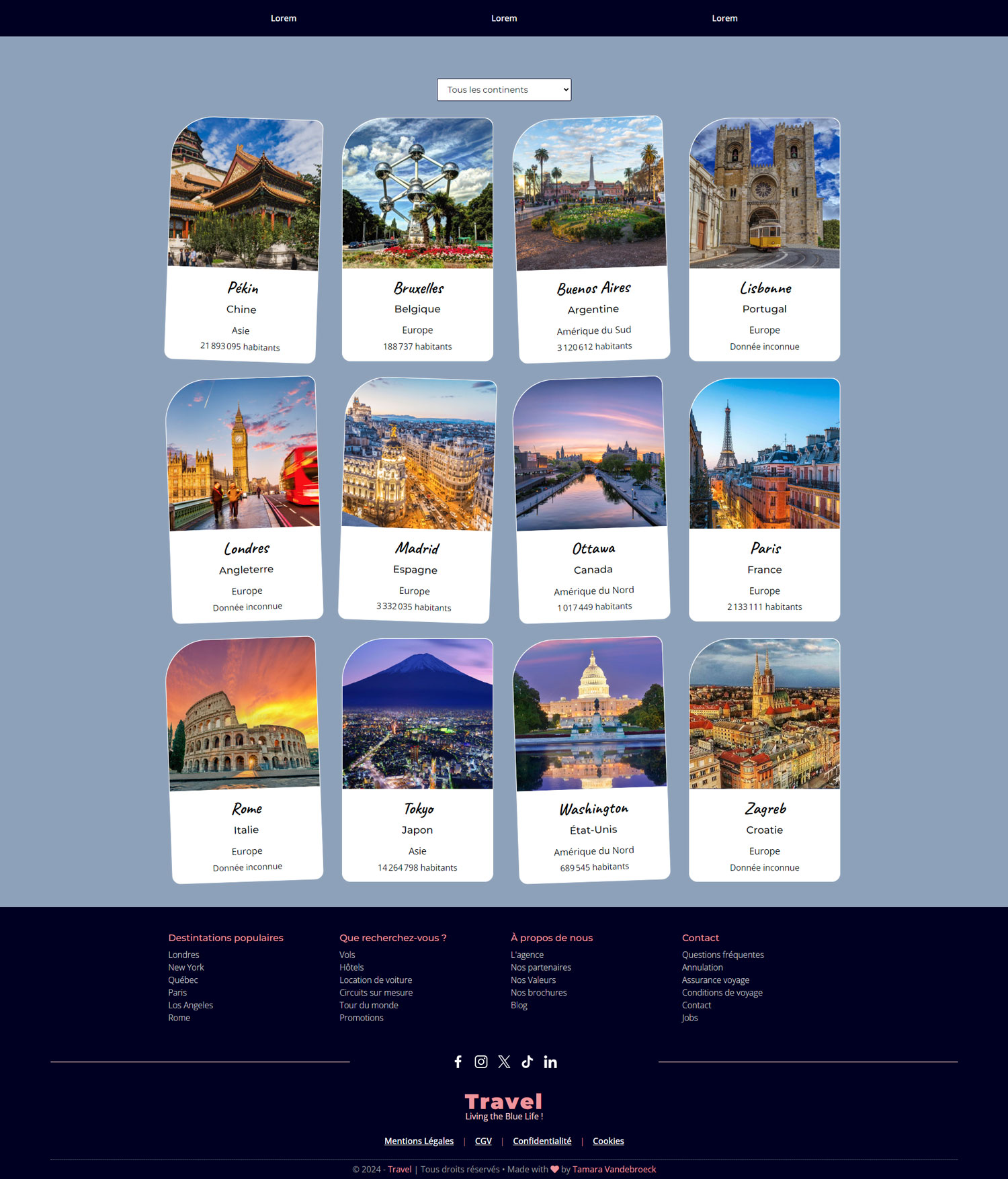 Using a table of data in JavaScript, this project displays information for each city and filters it by continent to test the filter function in JavaScript.