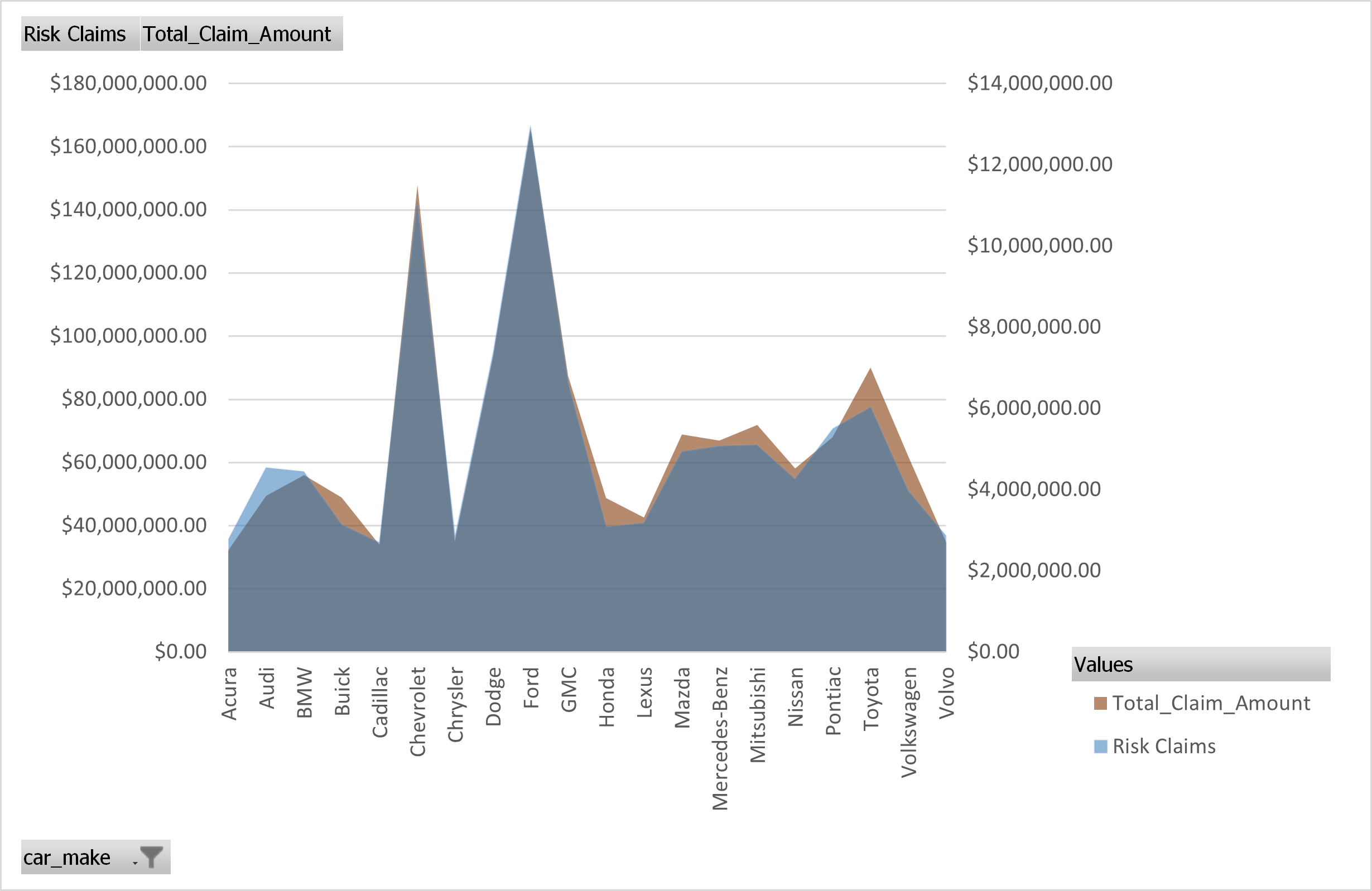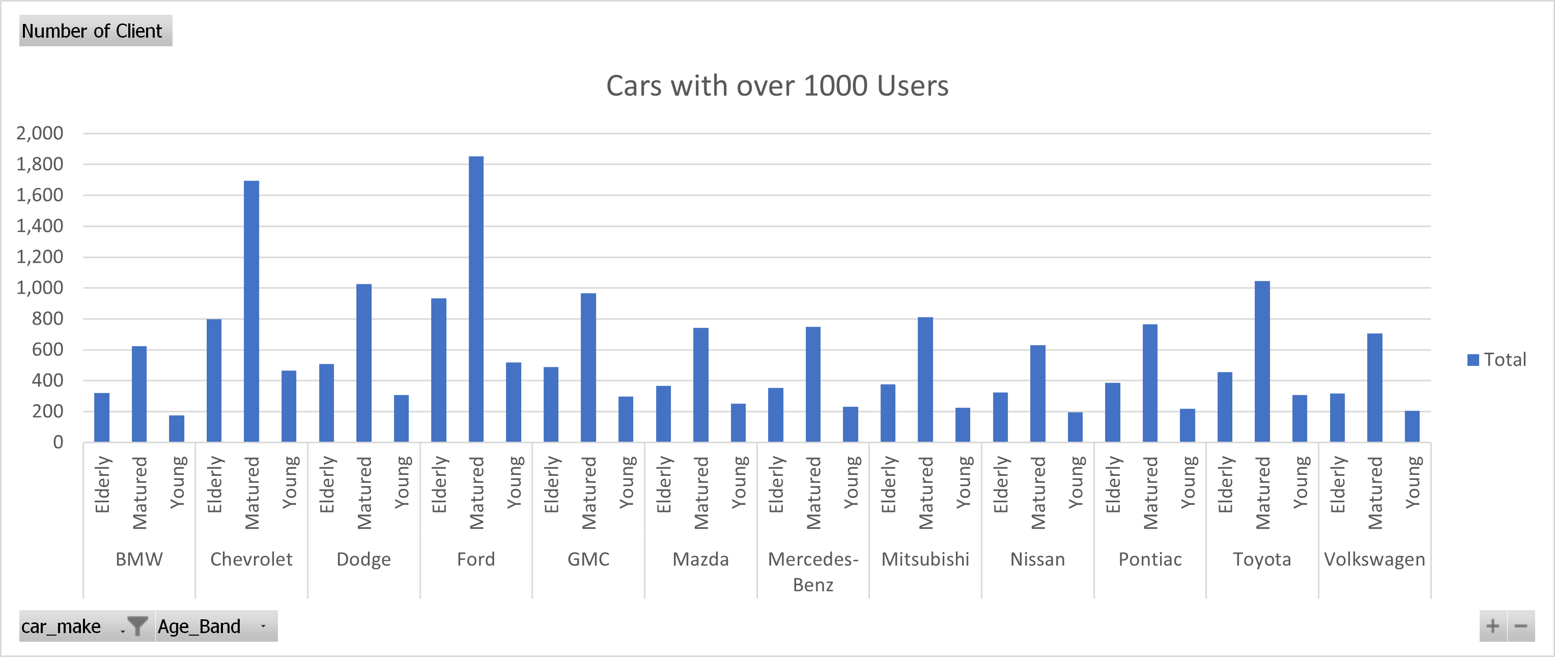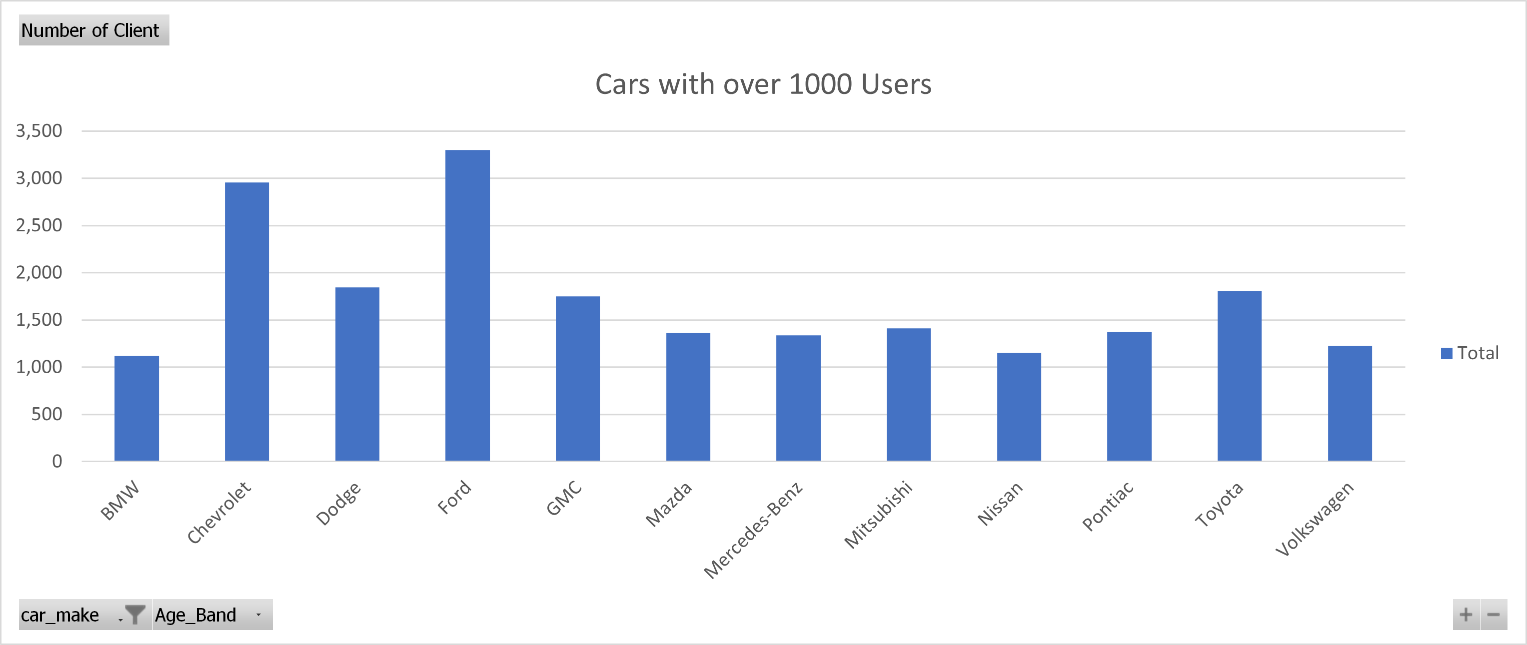 Cars with highest claims are Ford Chevrolet, GMC, and Toyota, this is most likely due to their high possessions by individuals as the image below shows they are among the cars used by over 1000 individuals.