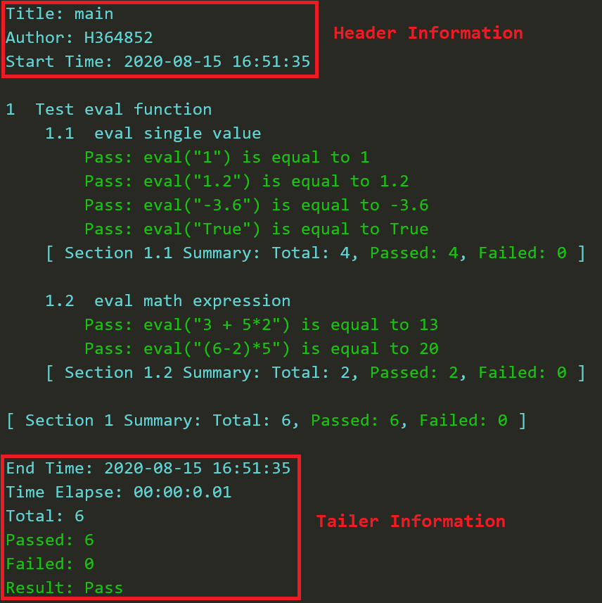If expression is True, it will print "Pass: (<expression>) is True" and log in three output files. Else "Fail: (<expression>) is False" will be printed and logged.