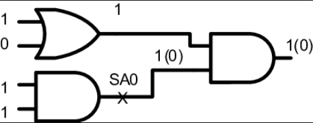 As you can see from this example, if there were no faults present on the circuit, then the output would be 1 given this test vector. Since there is a stuck at 0 fault on the first AND gate, the output of the circuit is 0 since the final AND gate is fed a controlling value, leading to incorrect logic.