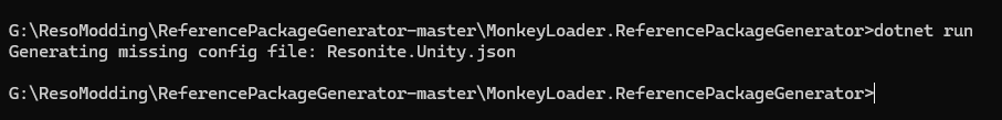 Now last thing we need to do it Generate the Json File open the folder with the .csproj which should be ReferencePackageGenerator\MonkeyLoader.ReferencePackageGenerator in the new prompt type dotnet run