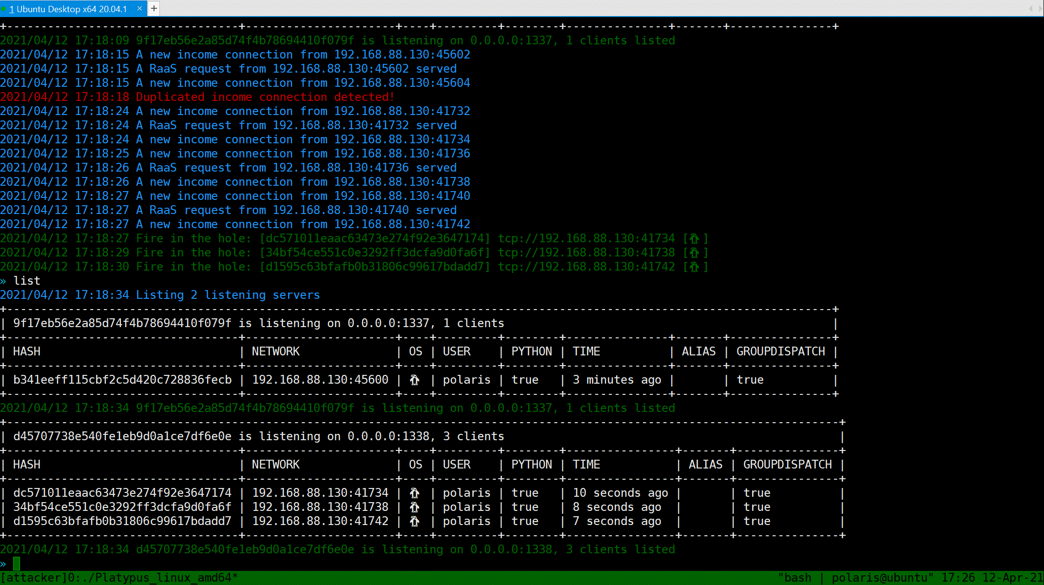 Also, platypus will print help information about RaaS which release you from remembering tedious reverse shell commands.