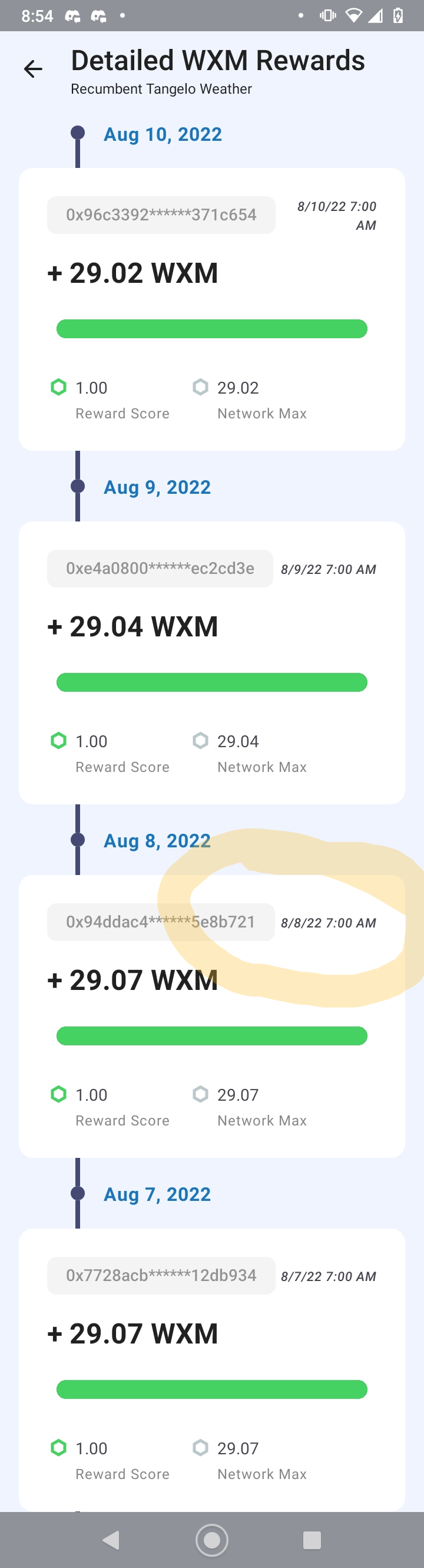 I am only noticing this 2 1/2 days after the fact. As a result, I cannot know if the app, during that 2 hour and 15 minute window between the failed and successful transaction, either in the detailed WXM rewards page or in the WXM rewards chart, showed rewards had happened at 7am localtime (noon UTC), even though no rewards would have appeared in the wallets of station owners. That is a definite concern of using an exact noon time in the app display for the reward time (perhaps that is when the rewards are calculated in the back end rather than when the WXM tokens are actually awarded to the station owner).