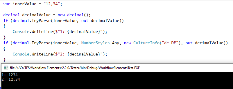 The Query - Get Results activity uses Decimal.TryParse when setting single values. This gives incorrect results when users have number formats with a comma instead of a decimal point, as illustrated in this example. The result is results that are 100x larger than expected.