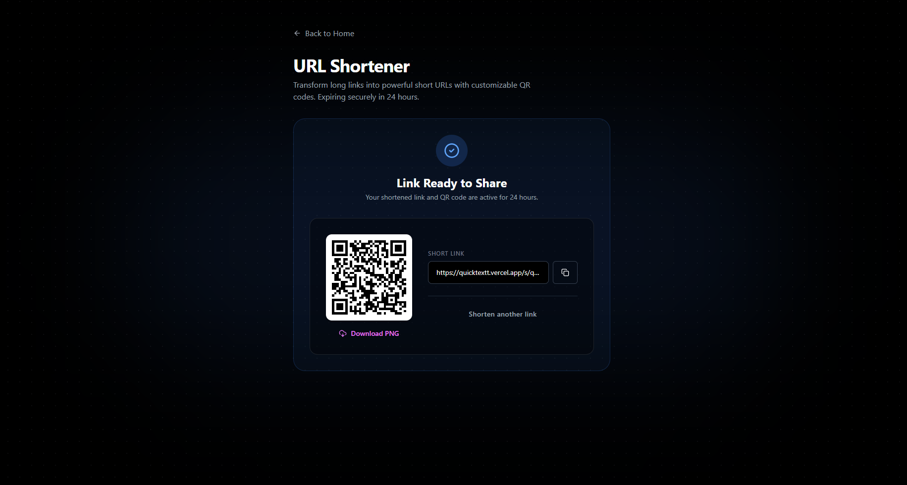 quicktextt.vercel.app/s/mnopqr. - Dynamic QR Code Generation: Instantly builds an SVG/PNG scannable code. Download it straight to your device to print on posters or integrate into digital campaigns.