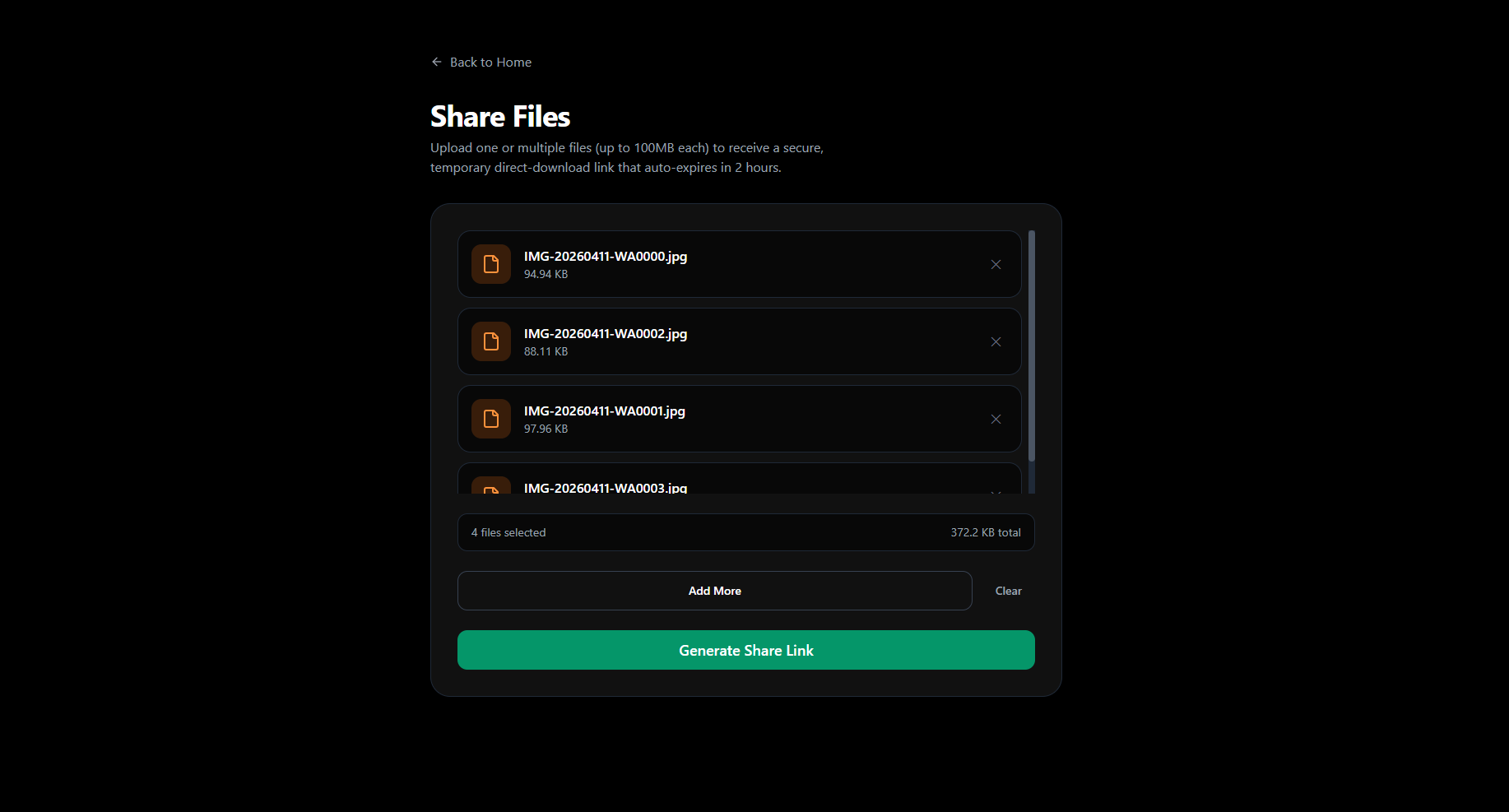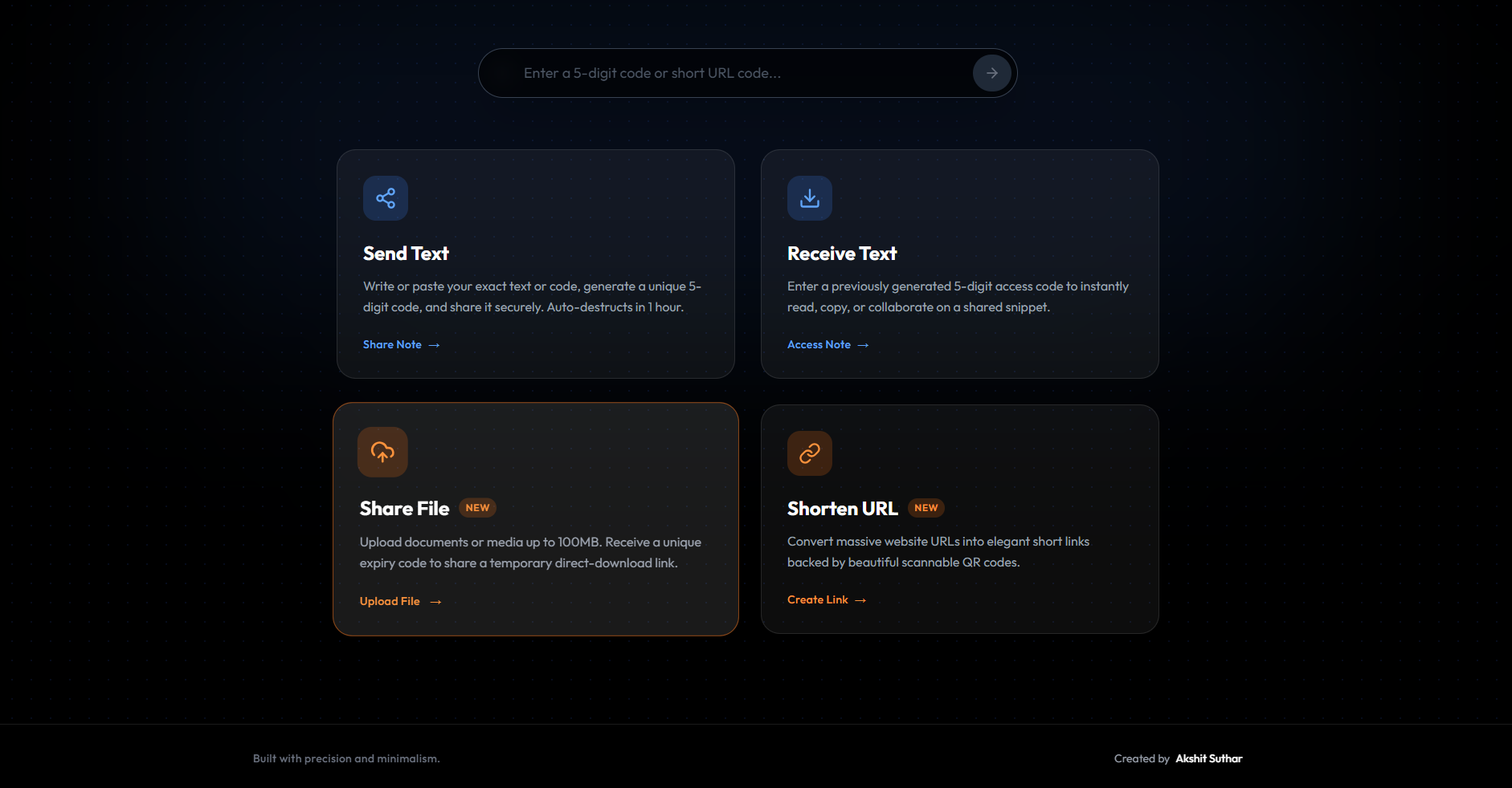- No Identity Required: Share anonymous binary data. Just upload, get a 5-digit code, and share.