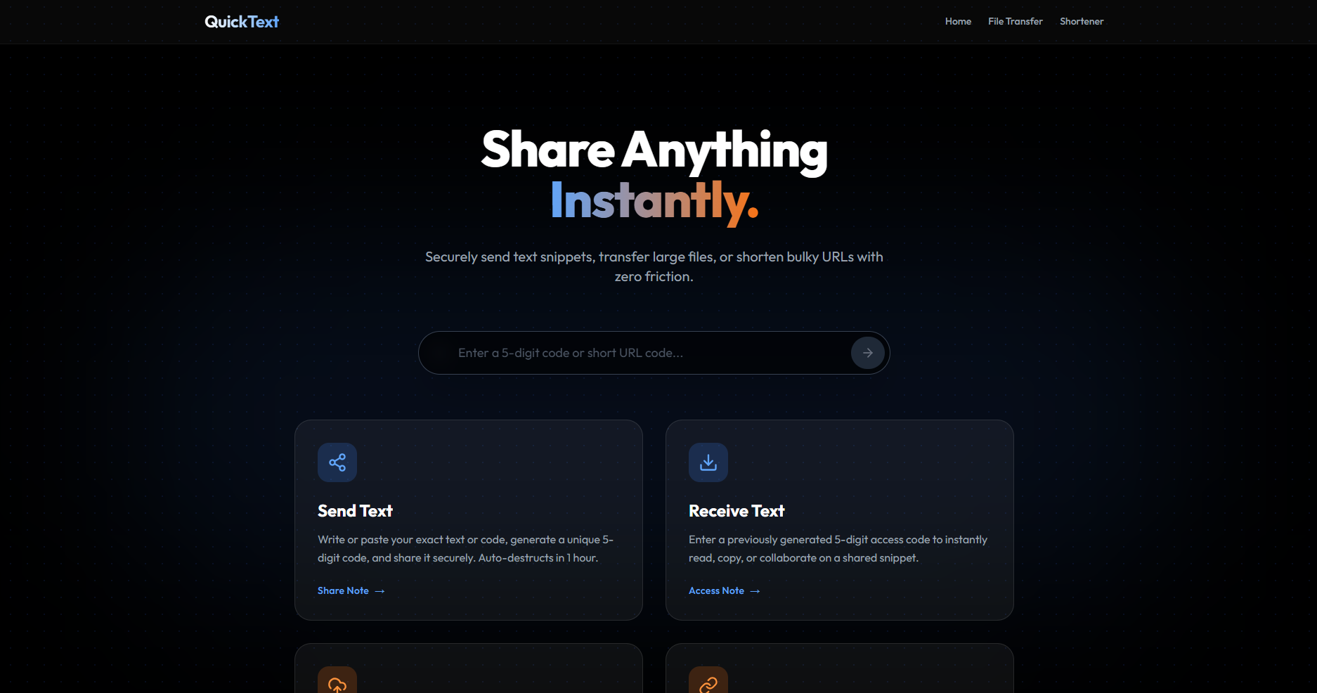 QuickText is a zero-friction, incredibly fast web utility built to instantly transfer text snippets, share heavy files anonymously, and shorten massive tracking URLs into clean, readable formats. All powered by highly-performant modern technologies.
