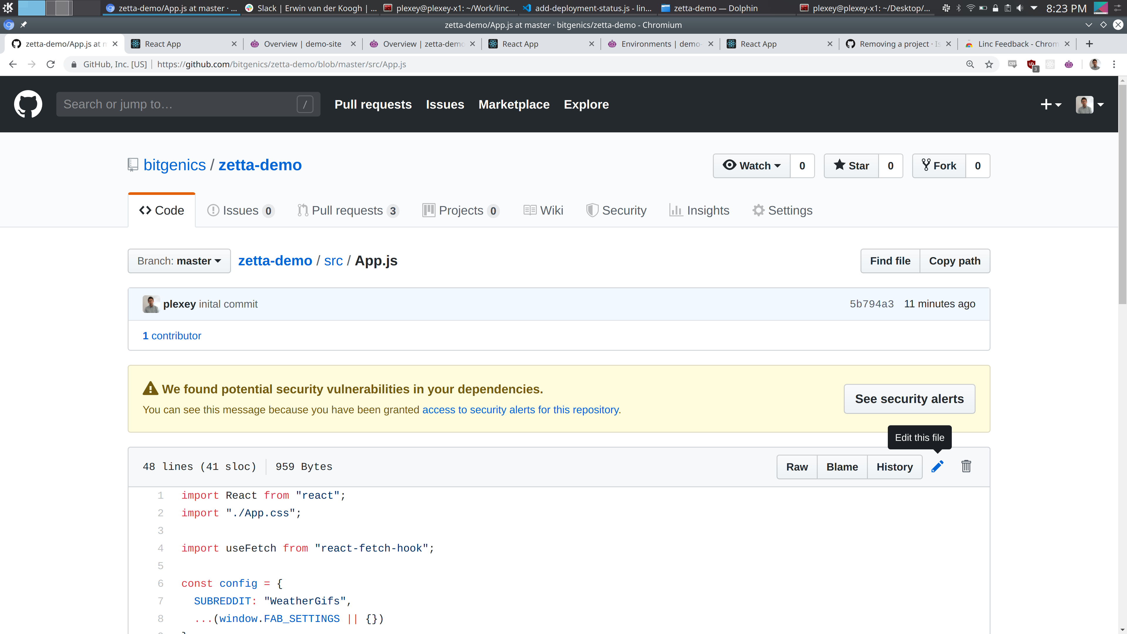 Next up is making a change. Go to src/App.js and click edit. It is the pencil in the top right corner. (image)