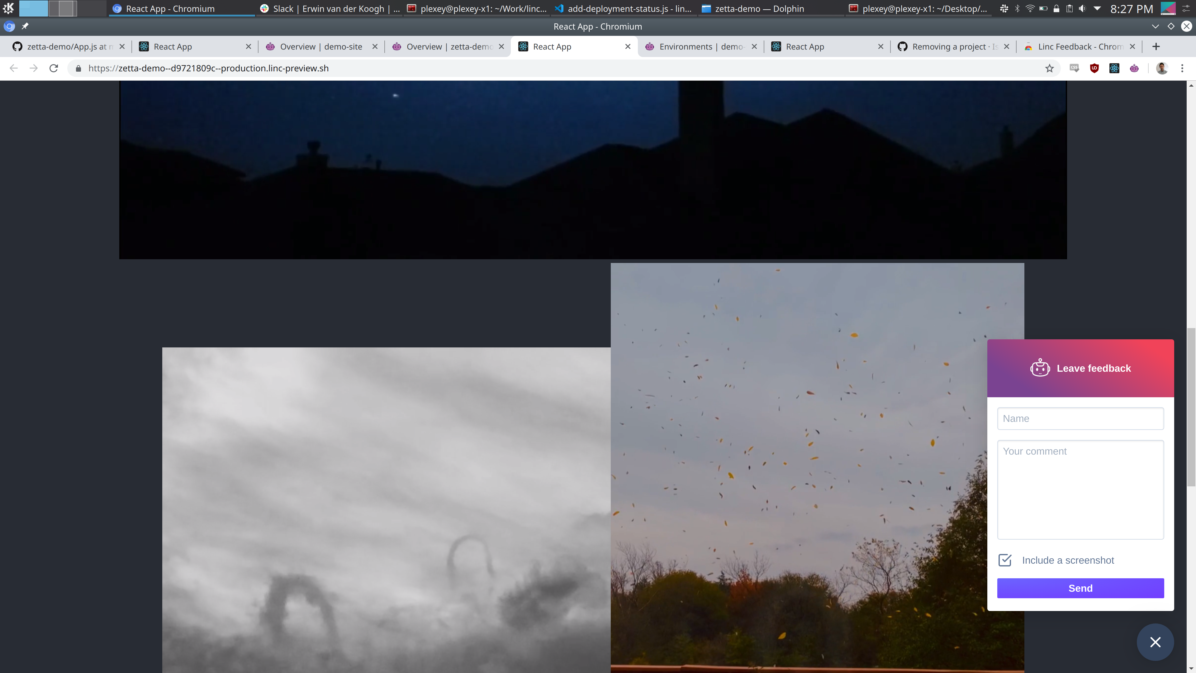 The next feature we want to show off is our beta feedback tool. If you install the Linc Chrome extension it will pop up a Linc logo on every preview link you are. And if you click on it it will give you a form to fill out with name and comment and it will upload that feedback comment with a screenshot and other browser data and send that straight to Linc and the relevant Pull Request in Github.