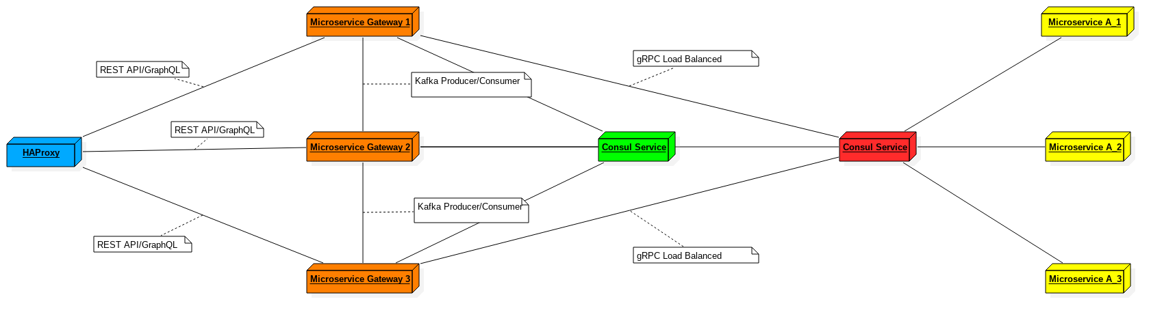 We start off using HAProxy to provide a singular exposed endpoint for the possiblity of n Microservice Gateways. Each of these gateways exposes either a REST or GraphQL endpoint(s), depending on the larger application requirements. THe ability to load balance between n of these, each knowing of ALL microservices available, allows us to minimize the response time back to a client. Notice, HAProxy can be configured to provide cookie based routing in the cases of WebSockets or other requests which are required to go to the same originating server.