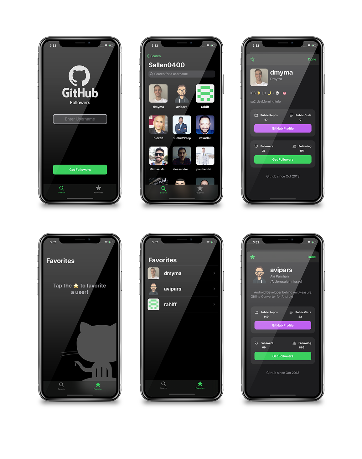 GitHub Followers app is designed to let a user browse the followers of a selected Github user. After selecting a follower, they can add them to their list of Favorites, view their profile or also view their followers. This project showcases: