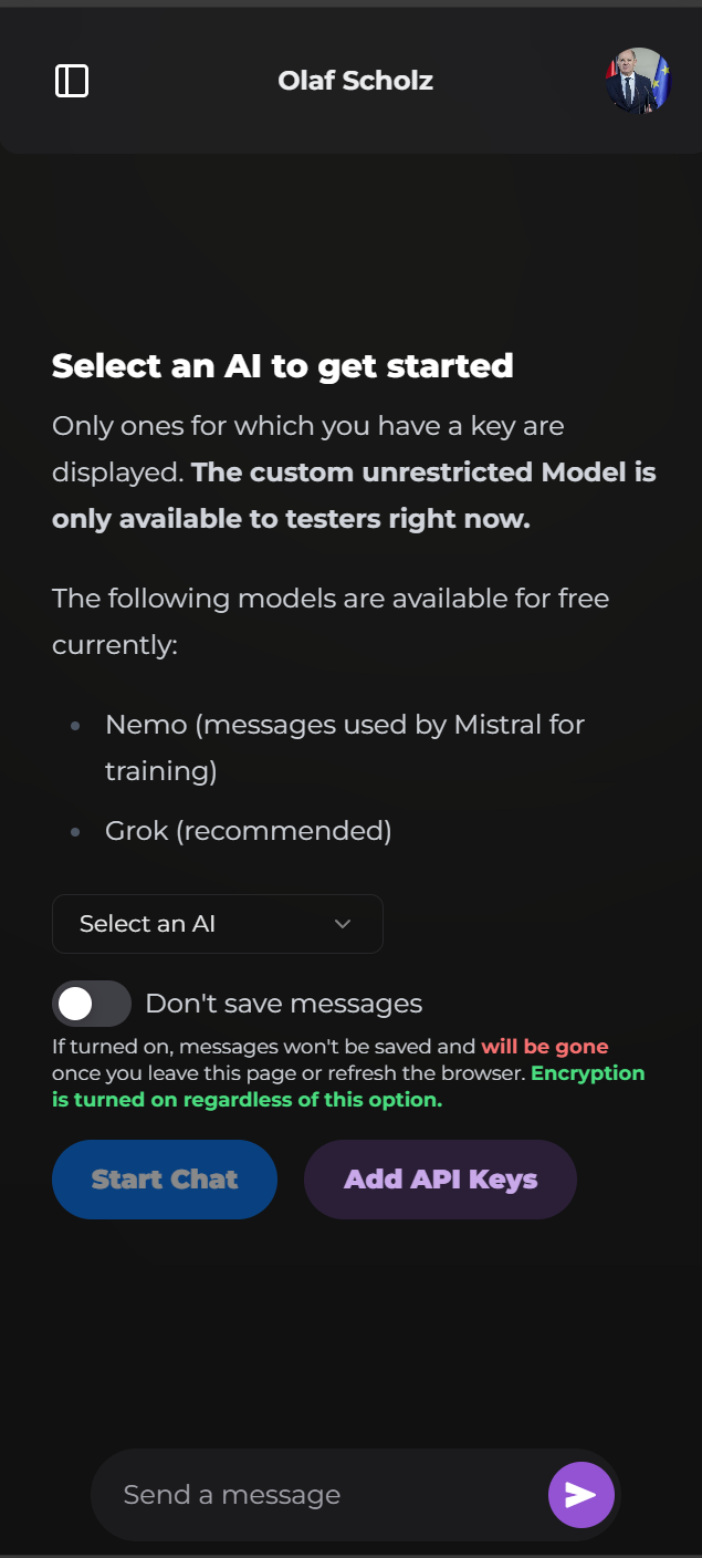 All messages are (kinda) end-to-end encrypted with your AI Model. The Model streams them in plain text to the browser, but since it's inside of an HTTPS connection, they are encrypted. Aside from that, they are only visible in plain text while in the browser, decrypted using a key generated with your password. Since your password is also stored (of course) encrypted in the database, it's basically impossible for your messages to be read by others.