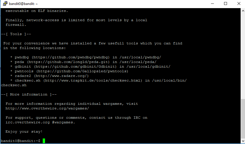 Now let's look at the informations we're given: The server address we need to connect is: bandit.labs.overthewire.org The port which will accept our SSH request is: 2220 Username and Password is: bandit0