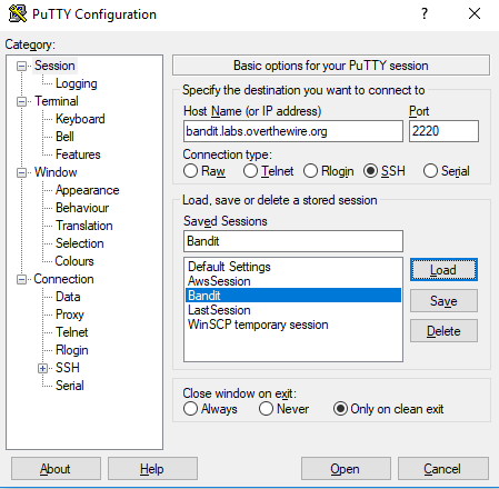 Now first, I set the address and port number, and click "Open" on PuTTY. This opens up a shell connection to the server, which asks for username and password. After entering "bandit0" in both, I gain the access.