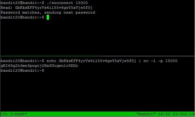 "There is a setuid binary in the homedirectory that does the following: it makes a connection to localhost on the port you specify as a commandline argument. It then reads a line of text from the connection and compares it to the password in the previous level (bandit20). If the password is correct, it will transmit the password for the next level (bandit21)."