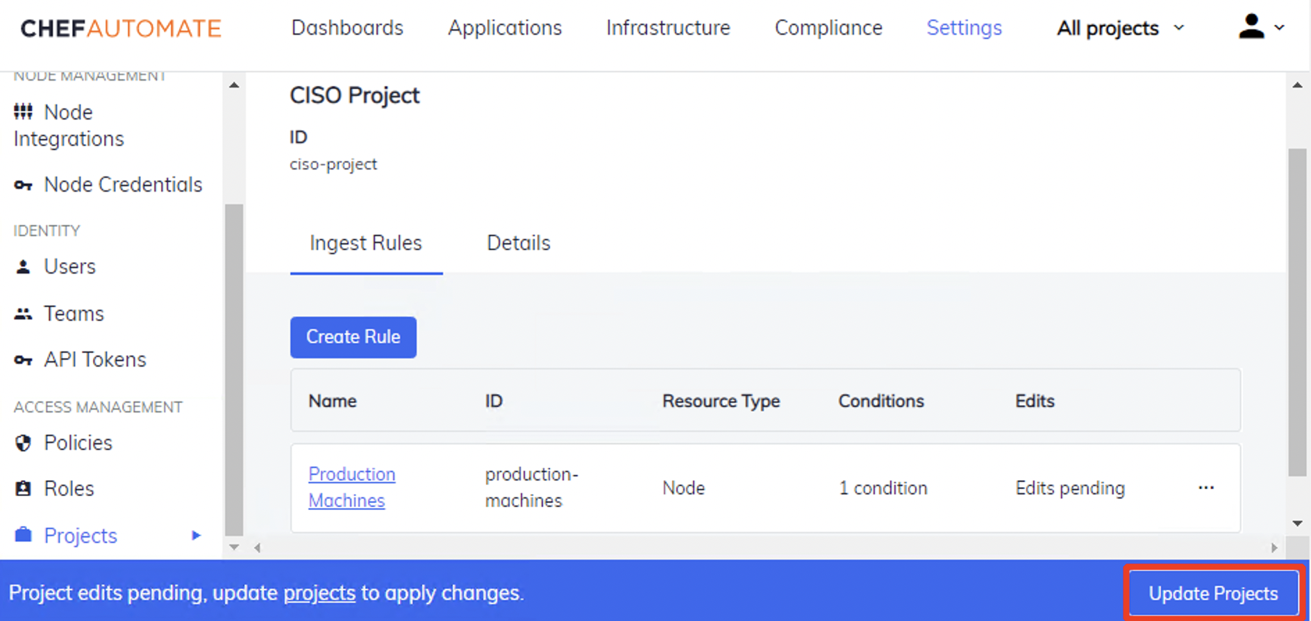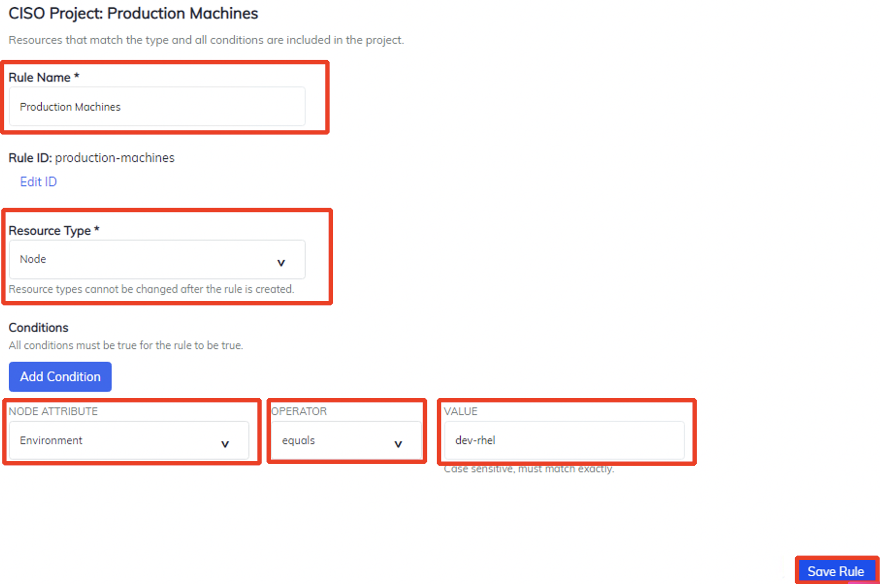 name: Production Machines>Resource Type: Node>Conditions: Environment=dev-rhel>Save Rule
