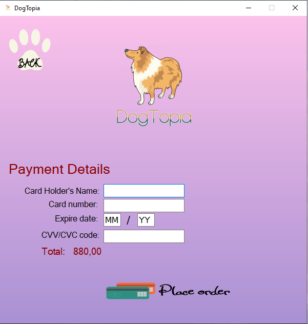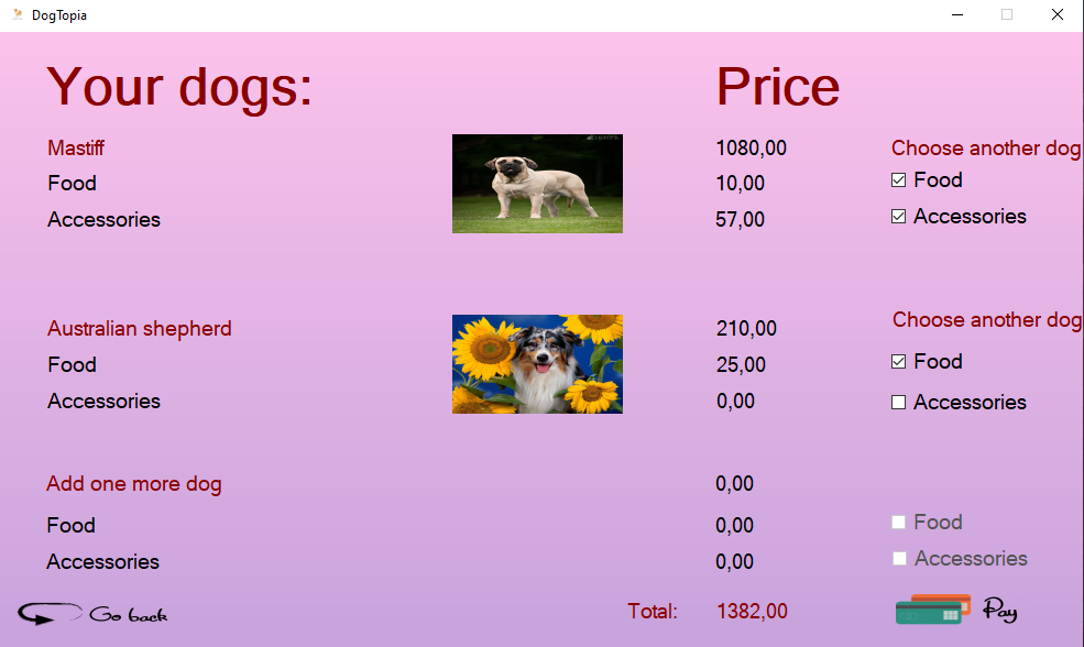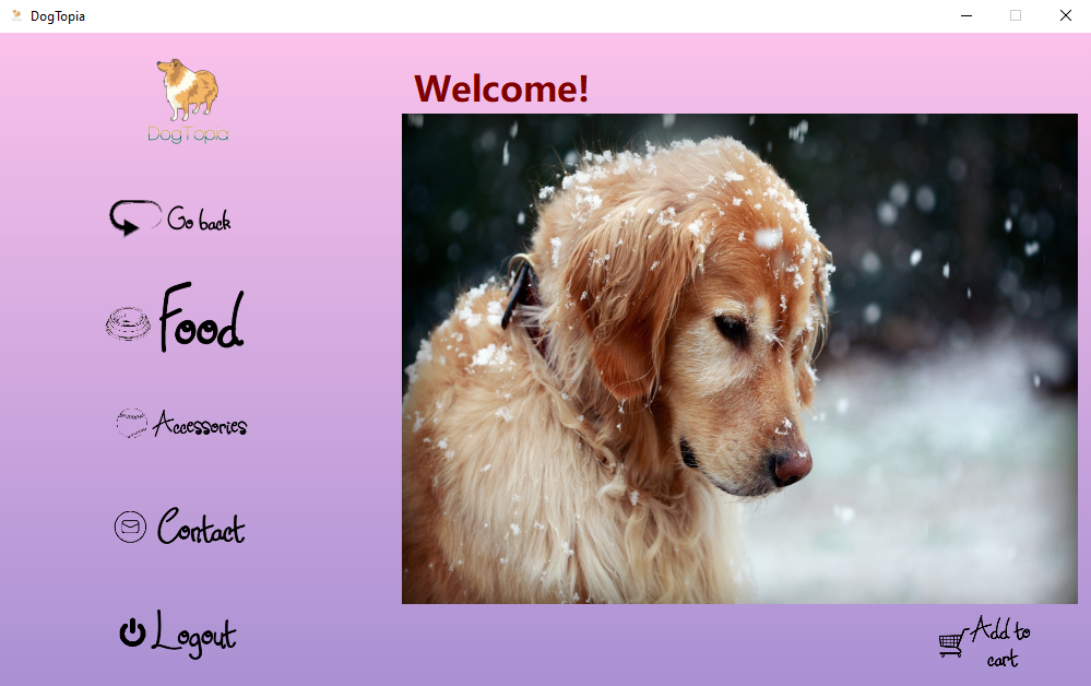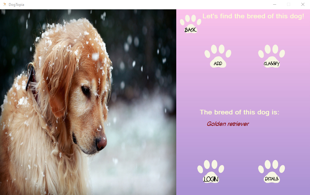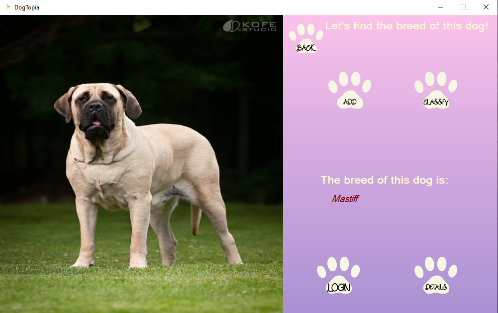 The application lets the user to introduce a photo of a dog and it will predict the dog's breed. Furthermore, the user can register to a database, and then log in to his account. He can add to the Shopping Cart dog food, accessories, as well as visit the website. The application tries to mimic an online payment as well.